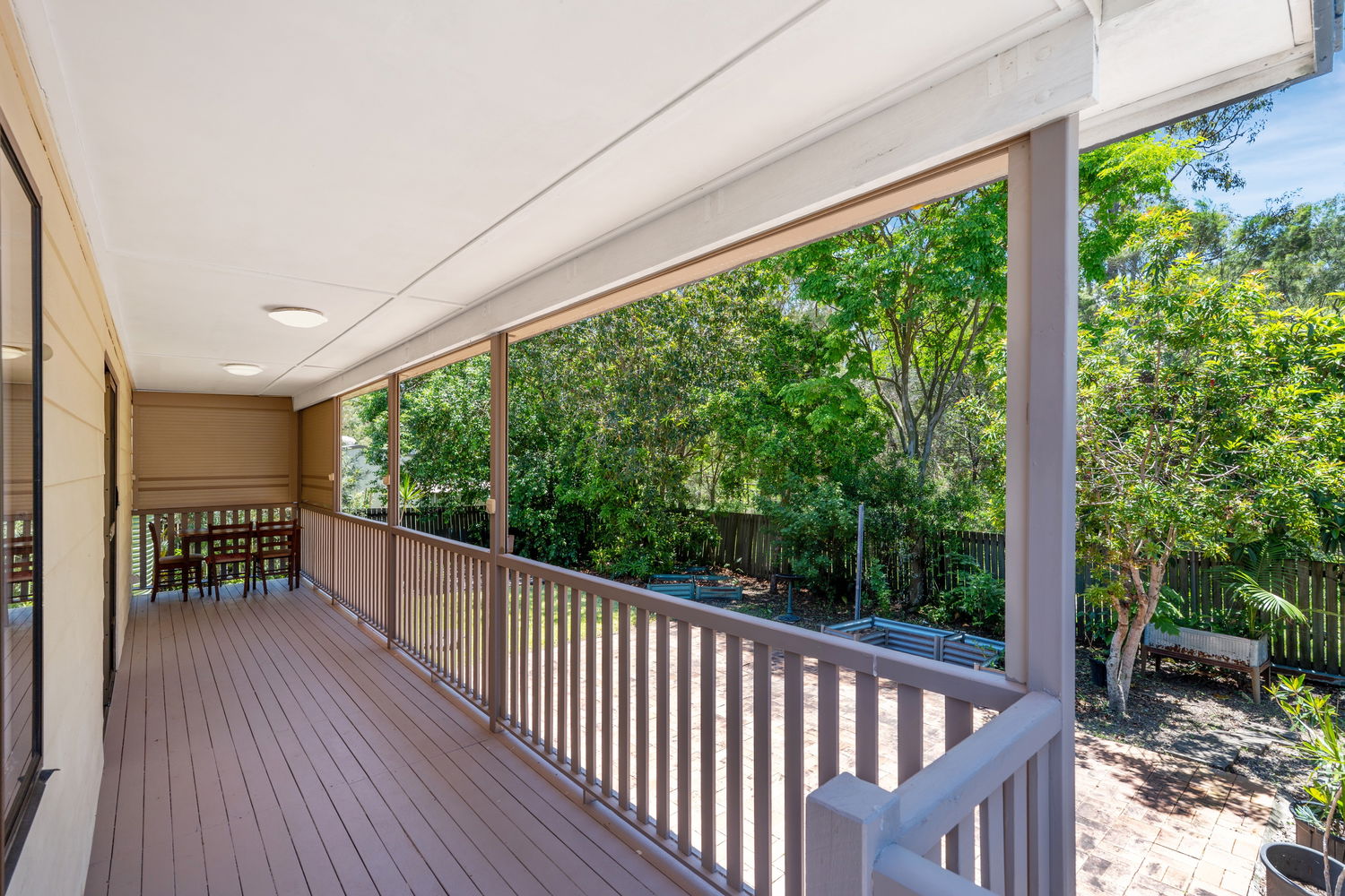 The back verandah runs the full length of the house and takes in the beautiful backdrop of