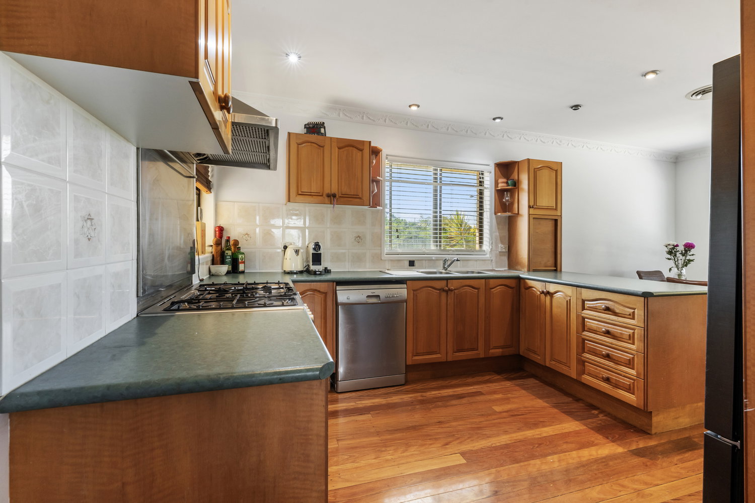 The kitchen and dining zone is practical and functional (with a five-burner gas cooktop and oodles of storage space!) making day to day living easy, while still leaving clear potential to modernise and add value.