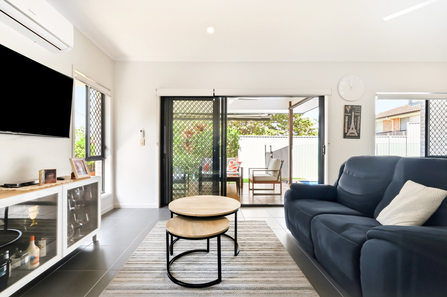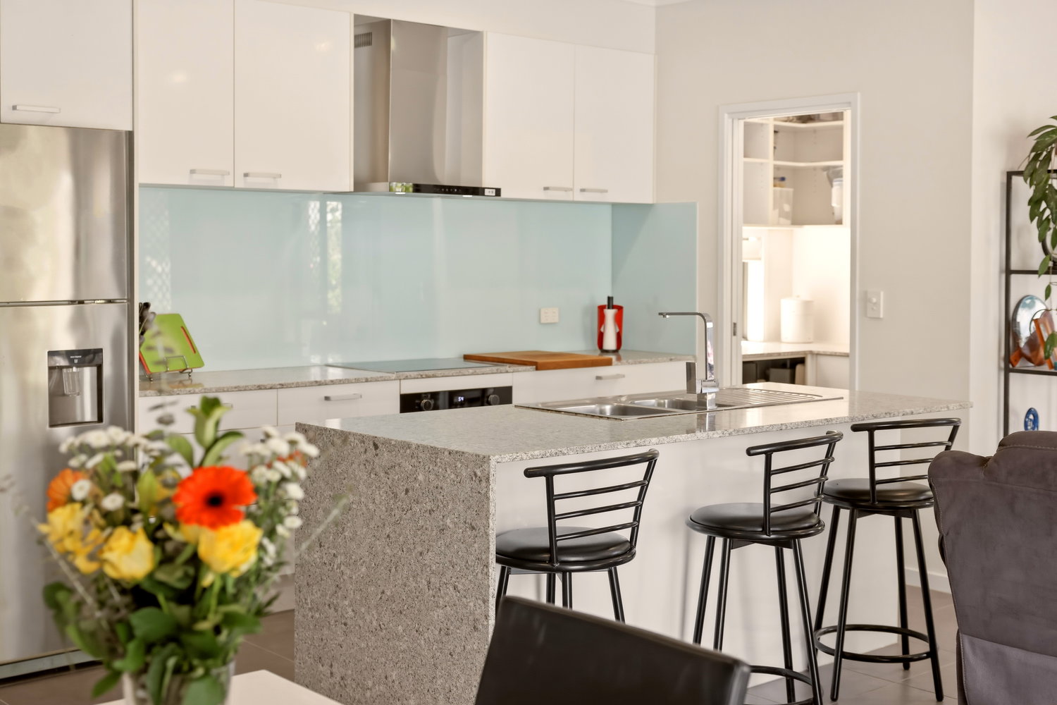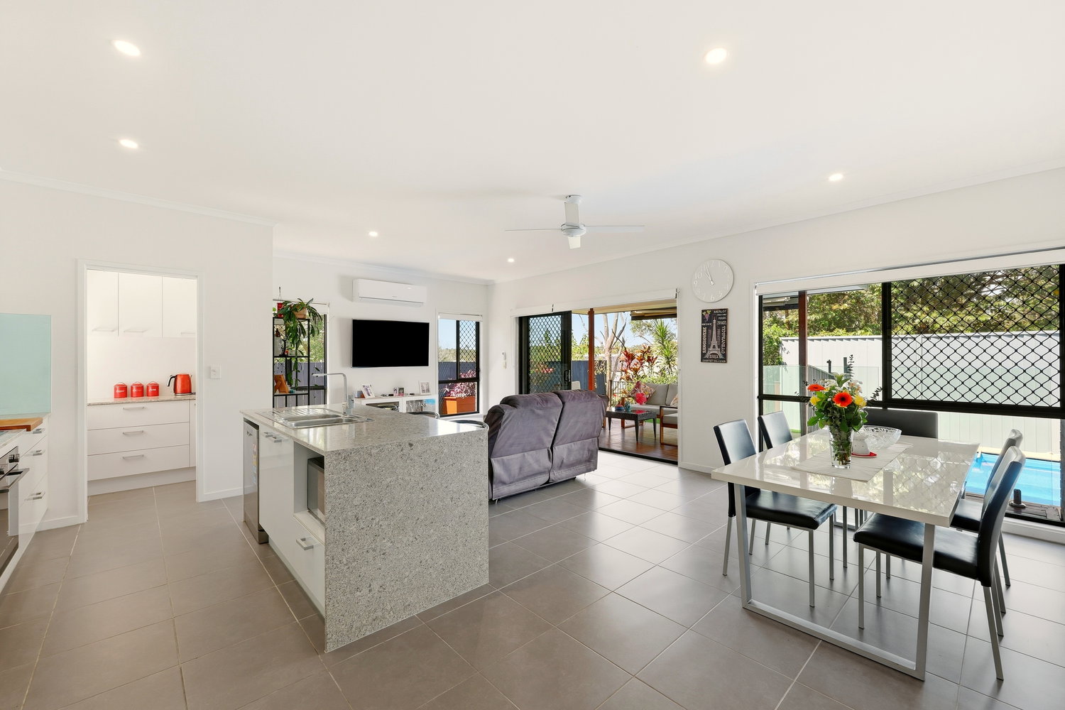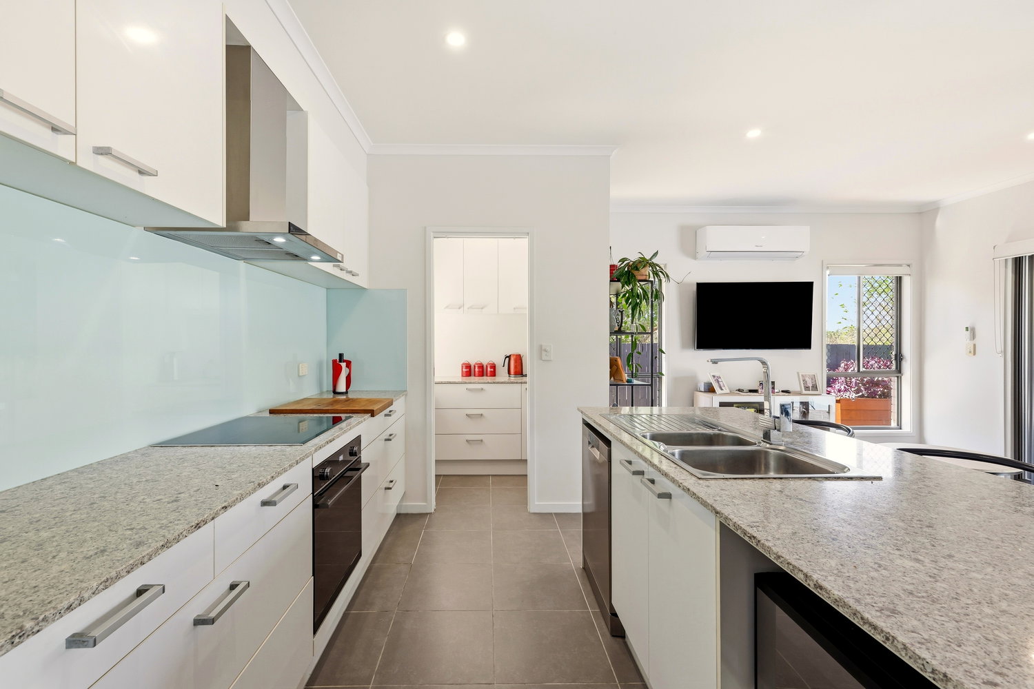 Set on a generous 474sqm parcel, the home’s thoughtful layout offers multiple living areas, ideal for both relaxation and entertaining. Soaring 2.7m high ceilings create an immediate sense of space, while the air-conditioned living areas ensure year-round comfort. At the heart of the home lies a contemporary kitchen featuring stone benchtops throughout, a walk-in pantry and quality appliances, the perfect space to create family meals or host friends.