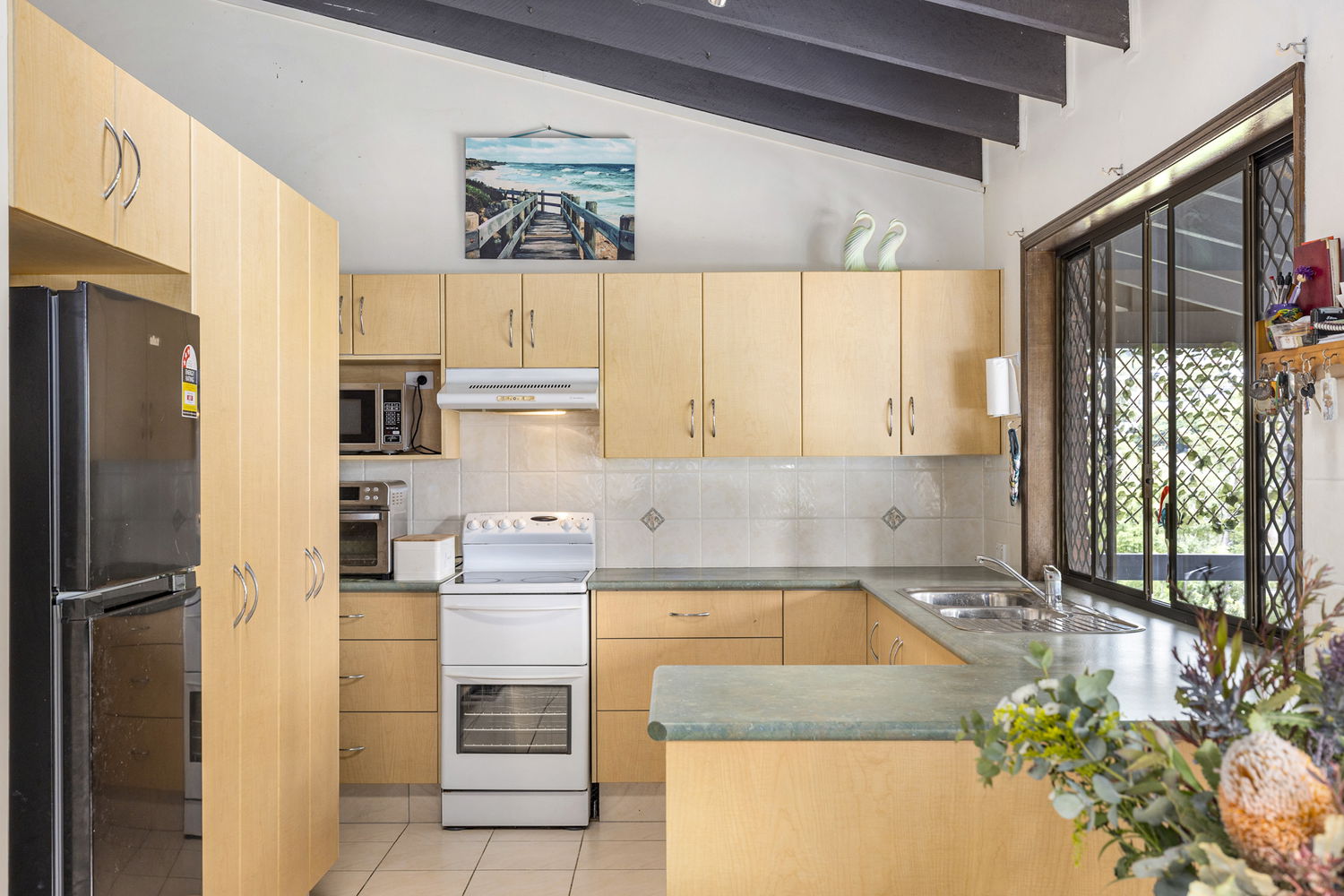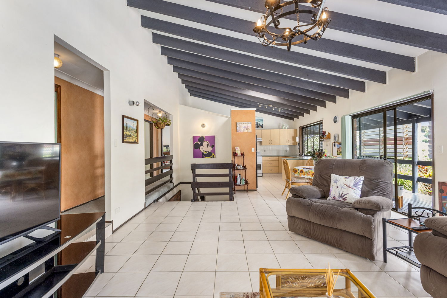 Upstairs, natural light fills the interiors, complemented by exposed high beams that create a sense of openness and warmth. The main living zone extends out to a wrap-around deck, ideal for taking in the elevated outlook and breezes.