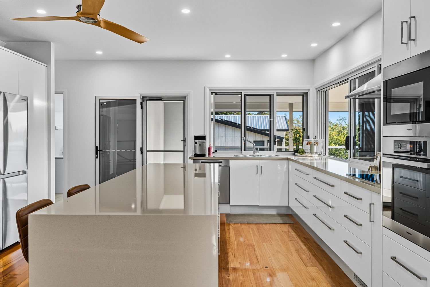 Sleek stone benchtops, island breakfast bar & smart storage solutions