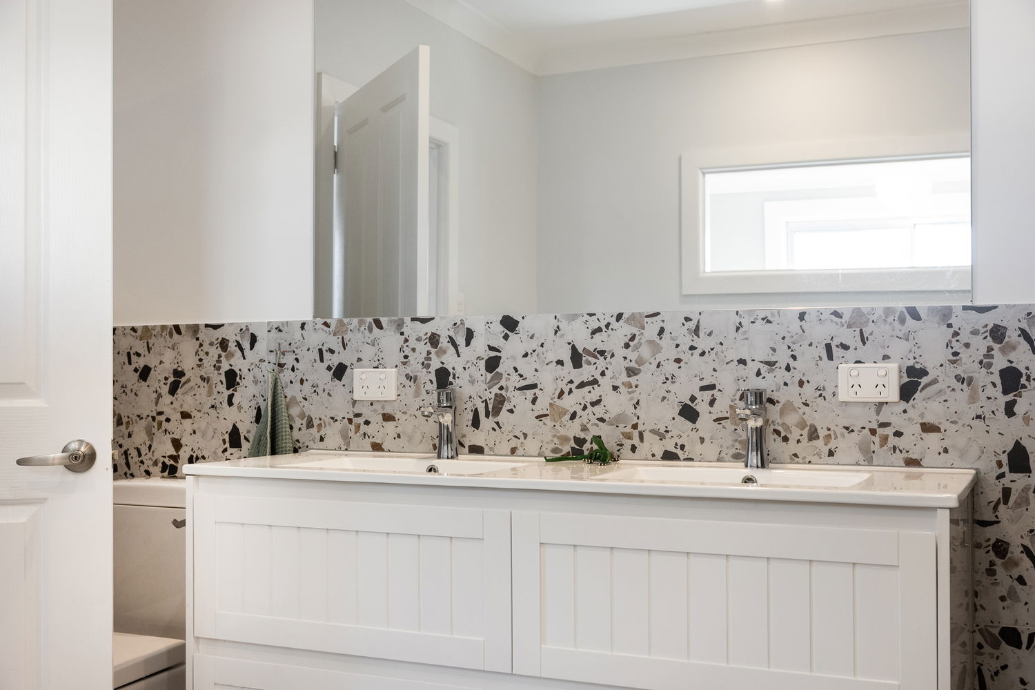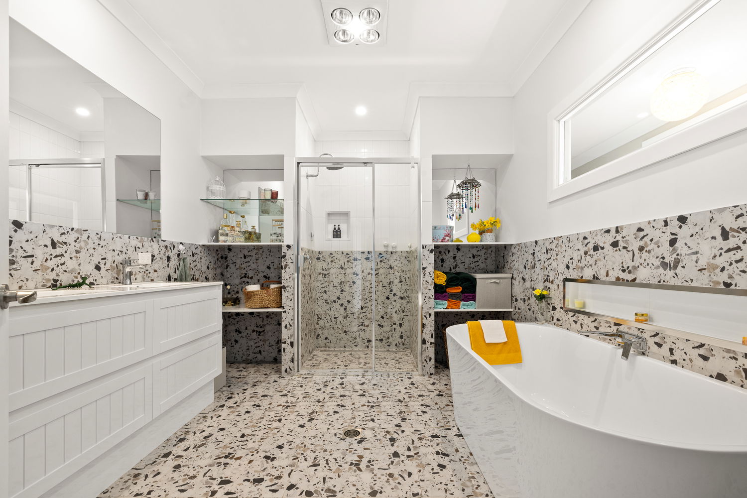 Upstairs showcases a bright, open-plan kitchen, dining, and living space enhanced by polished timber floors and character details. The brand-new kitchen features a walk-in pantry and island bench, flowing out to a sunny deck, perfect for everyday living and entertaining. Three spacious bedrooms are serviced by a stunning, fully renovated bathroom, a true standout with dual vanities, a free-standing bath, modern tiling, and designer lighting.
