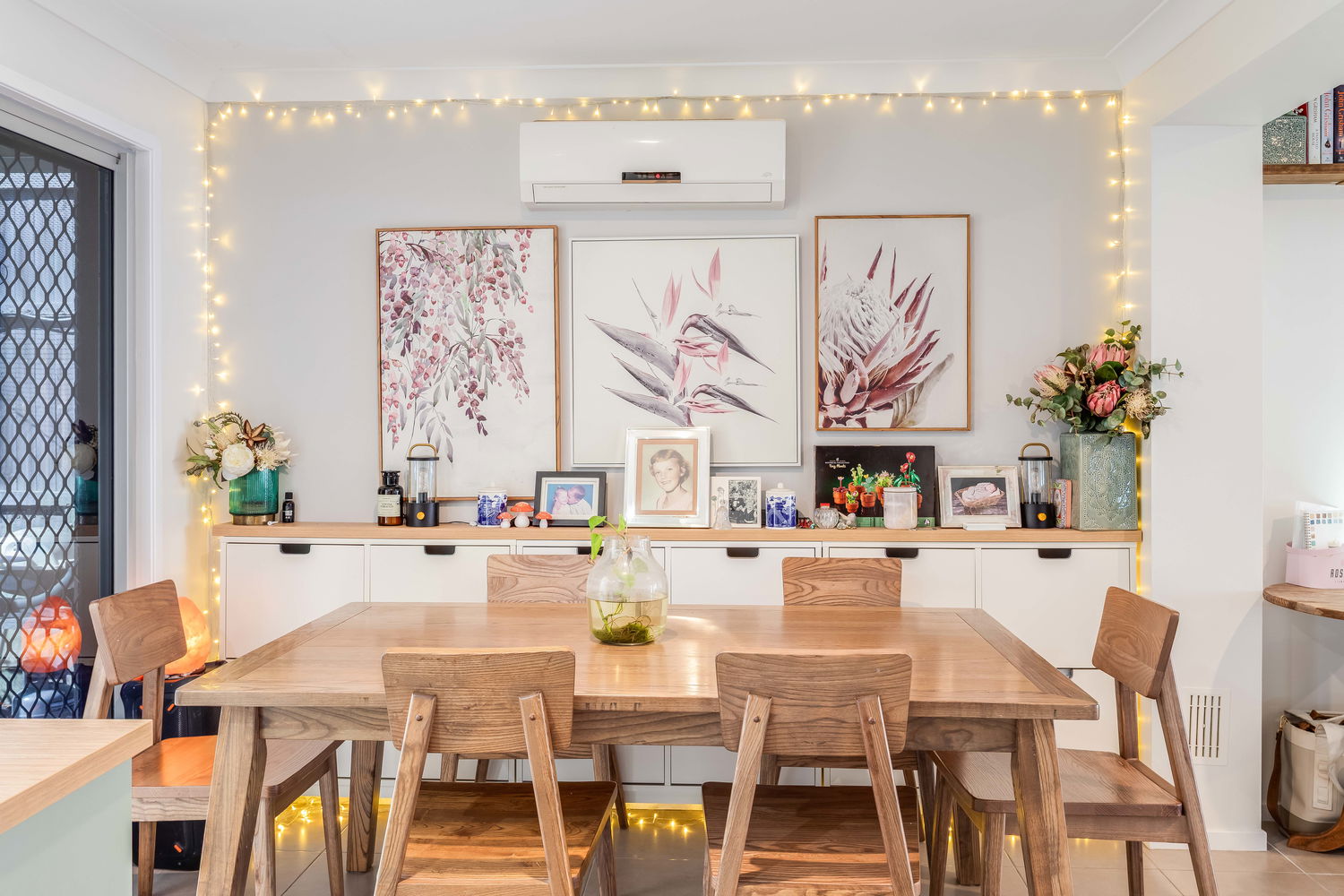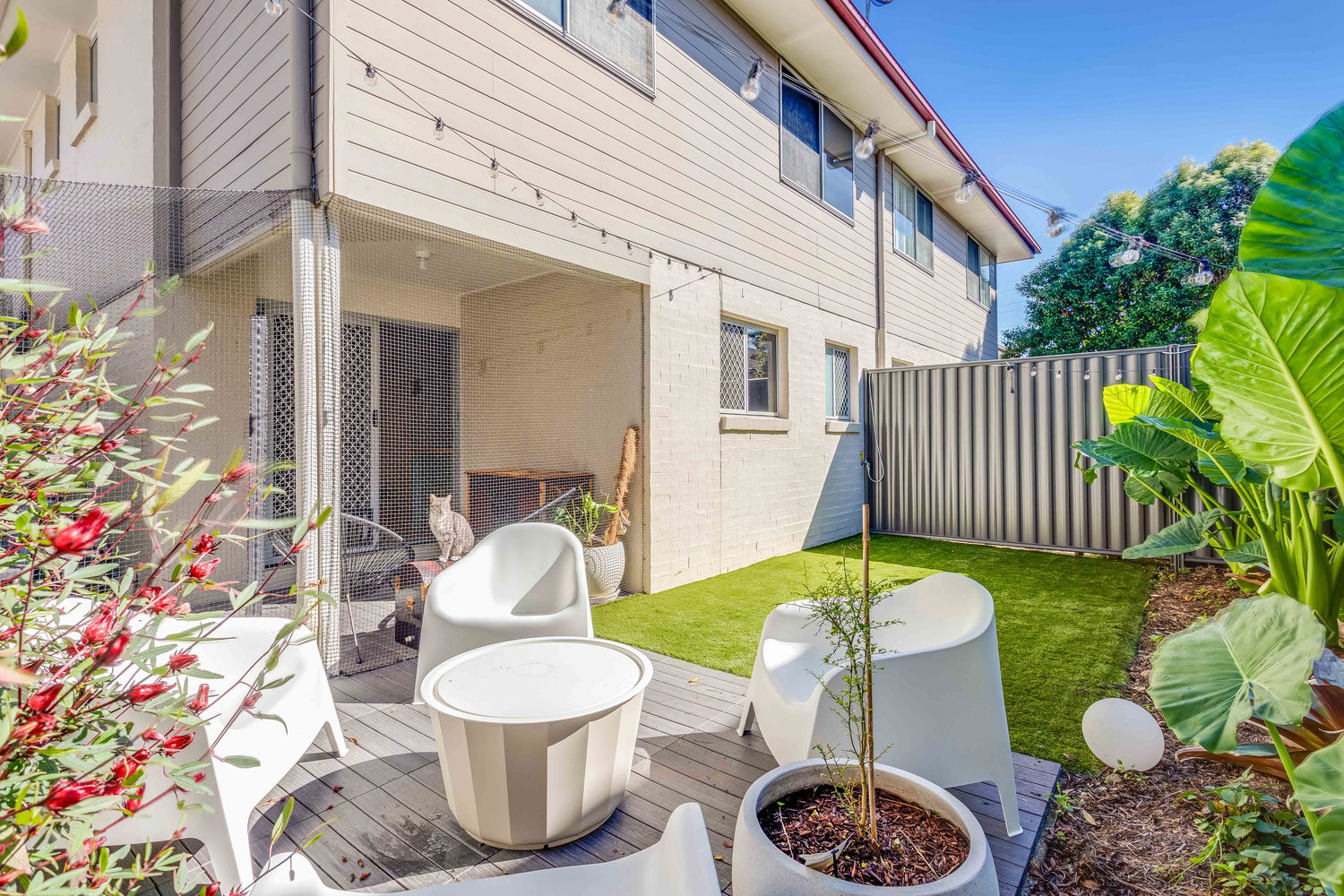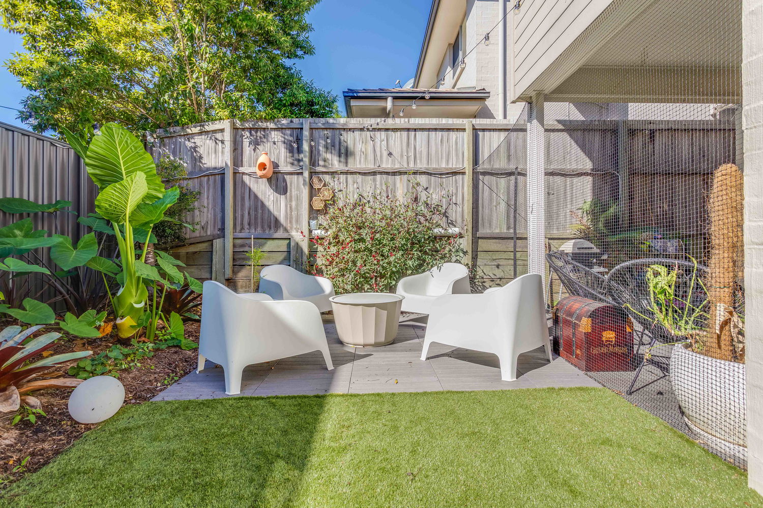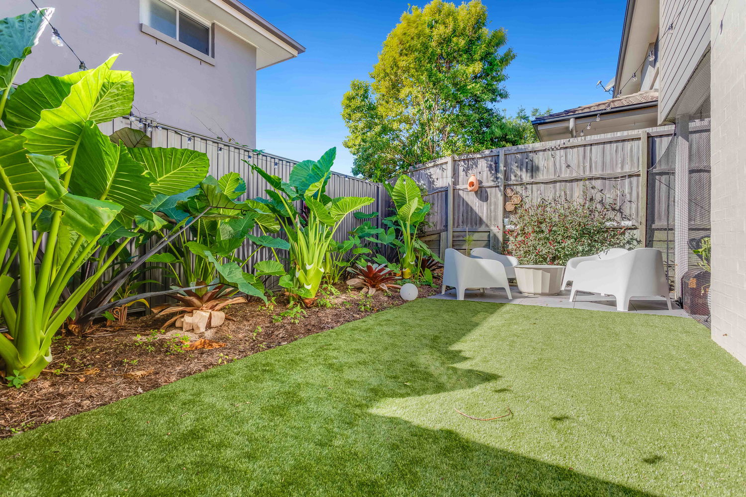 The ground floor unfolds into a light-filled, open-plan living and dining area, seamlessly connected to a renovated kitchen that impresses with its clean lines, modern cabinetry, and quality appliances, making it a delight for those who love to cook or entertain. This inviting living space flows effortlessly through sliding doors to a generously sized, fully fenced yard with additional height for extra privacy, a rare find for townhouse living. Here, lush landscaping and an easy-care synthetic lawn provide the perfect backdrop for morning coffee in the sun, relaxed gatherings with family and friends, or a safe and private space for children and pets to play under the Queensland sky.