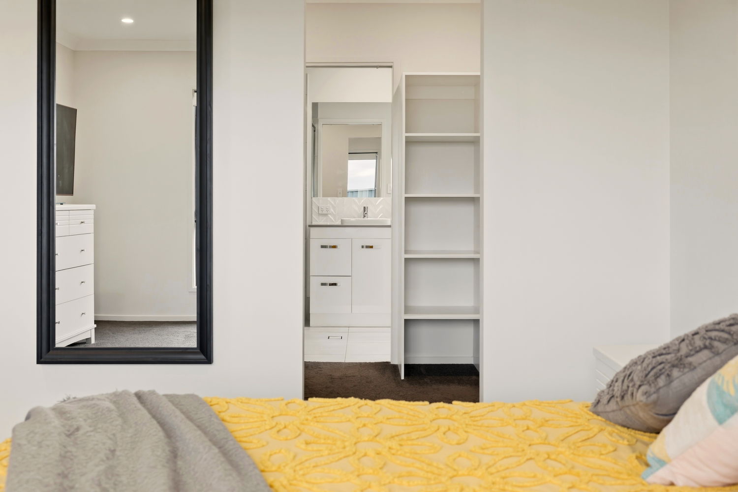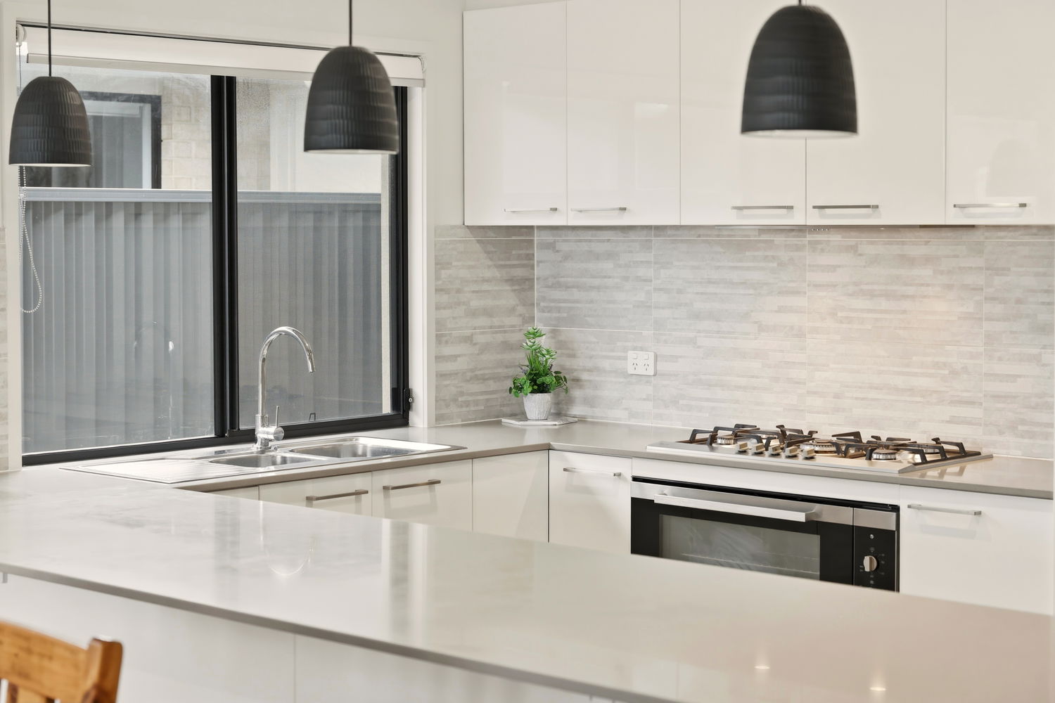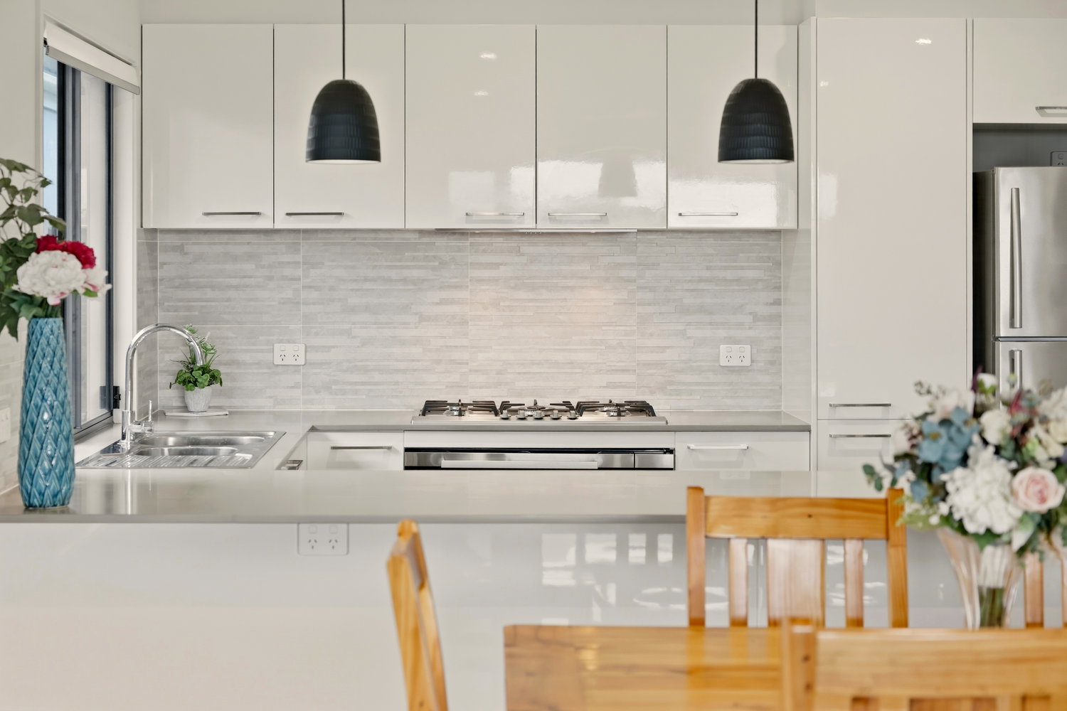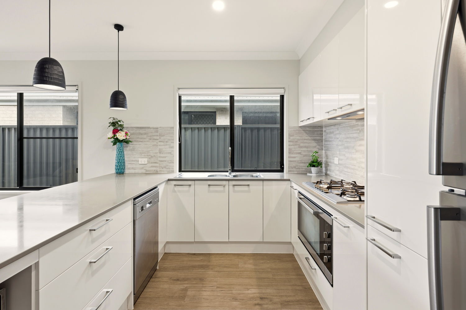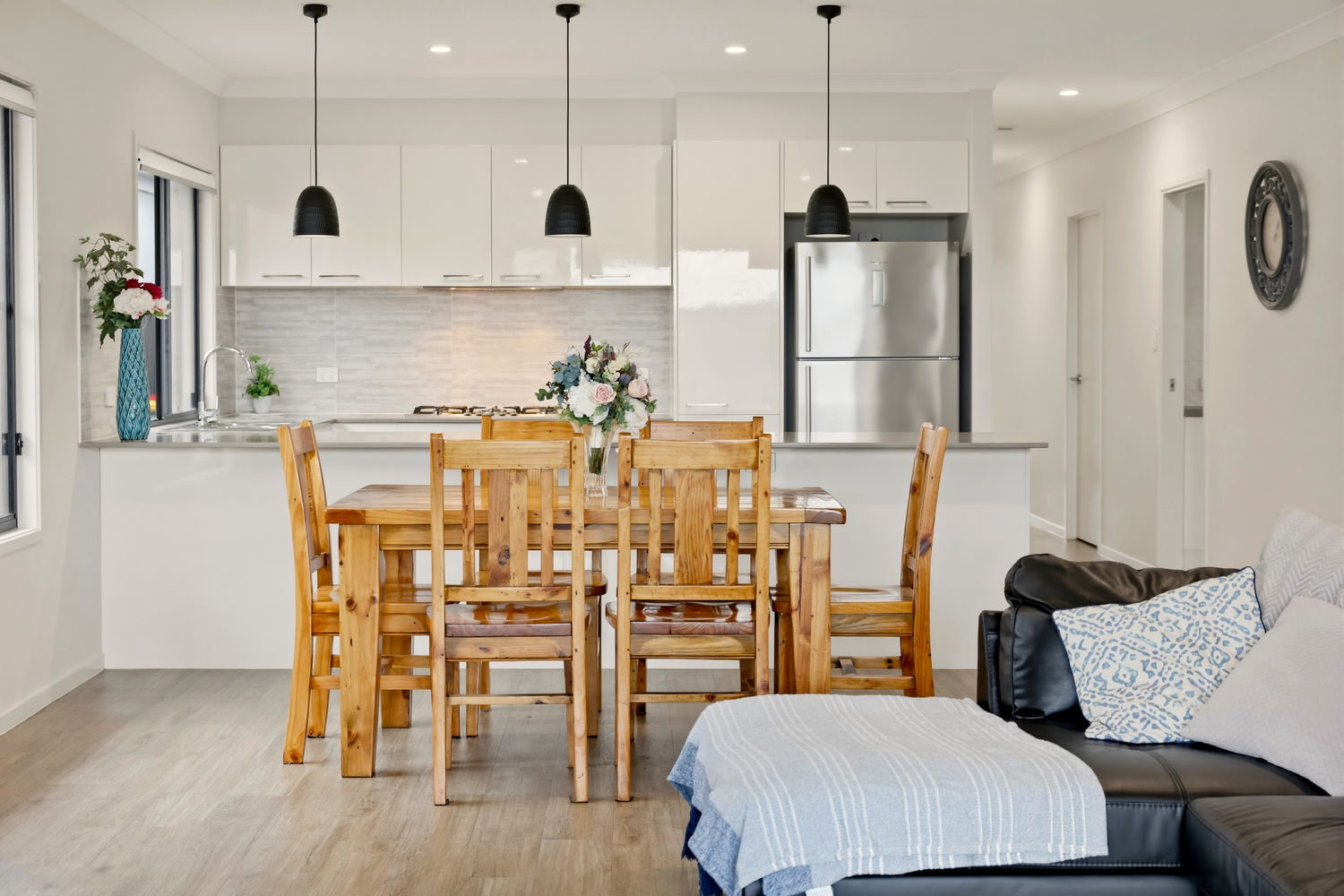 At the heart of the home, the large kitchen is sure to impress with its elegant stone benchtops, ample storage, gas cooking, and chic pendant lighting. A large laundry with extensive storage and bench space could also serve as a butler’s pantry, adding to the practicality of the design.
