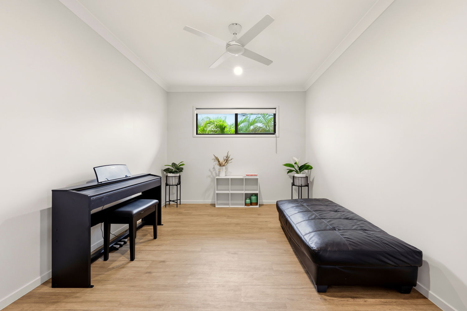 The spacious master bedroom is a luxurious retreat, boasting air conditioning, a walk-in robe, and a stylish ensuite. Two additional bedrooms are well-appointed with built-in robes and air conditioning, ensuring comfort for all family members. The fourth bedroom, currently utilized as a media room, is versatile with durable vinyl flooring.