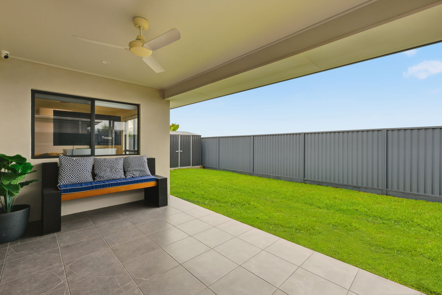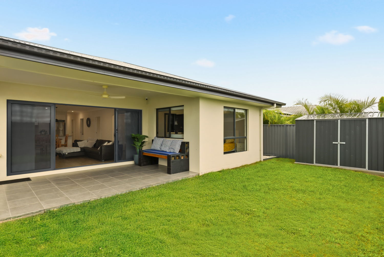 The air-conditioned open-plan living space opens up to a grand outdoor alfresco area, perfect for entertaining and relaxation. A garden shed offers additional storage for tools and equipment.