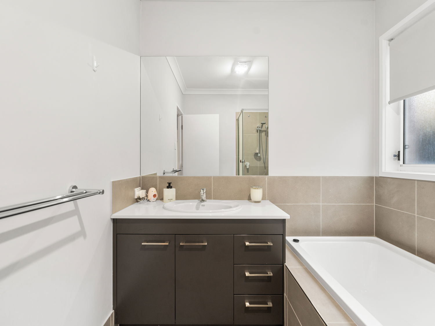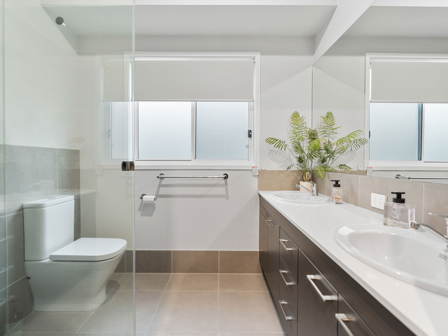 The master suite is privately positioned at the front of the home and offers a peaceful retreat complete with walk-in robe and a stylish ensuite featuring double basins and a large shower. A separate media room with a barn-style sliding door provides the ideal space for movie nights, a kids’ retreat or quiet relaxation away from the main living zone.