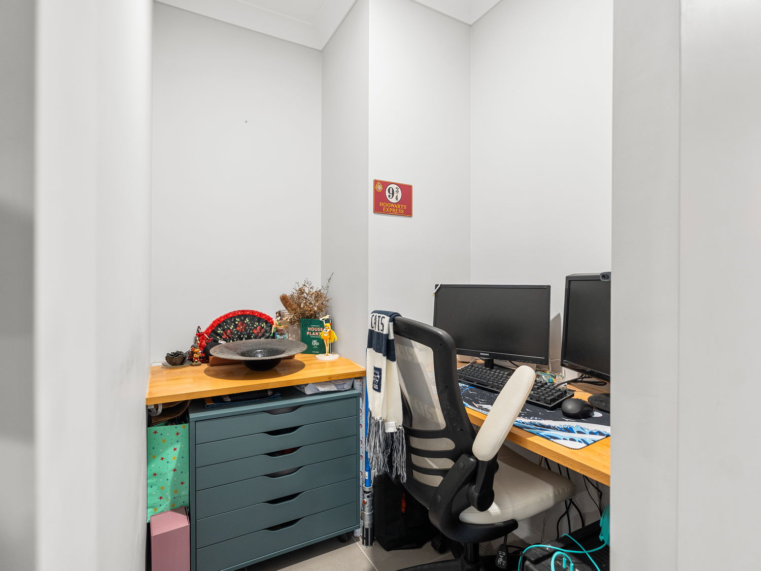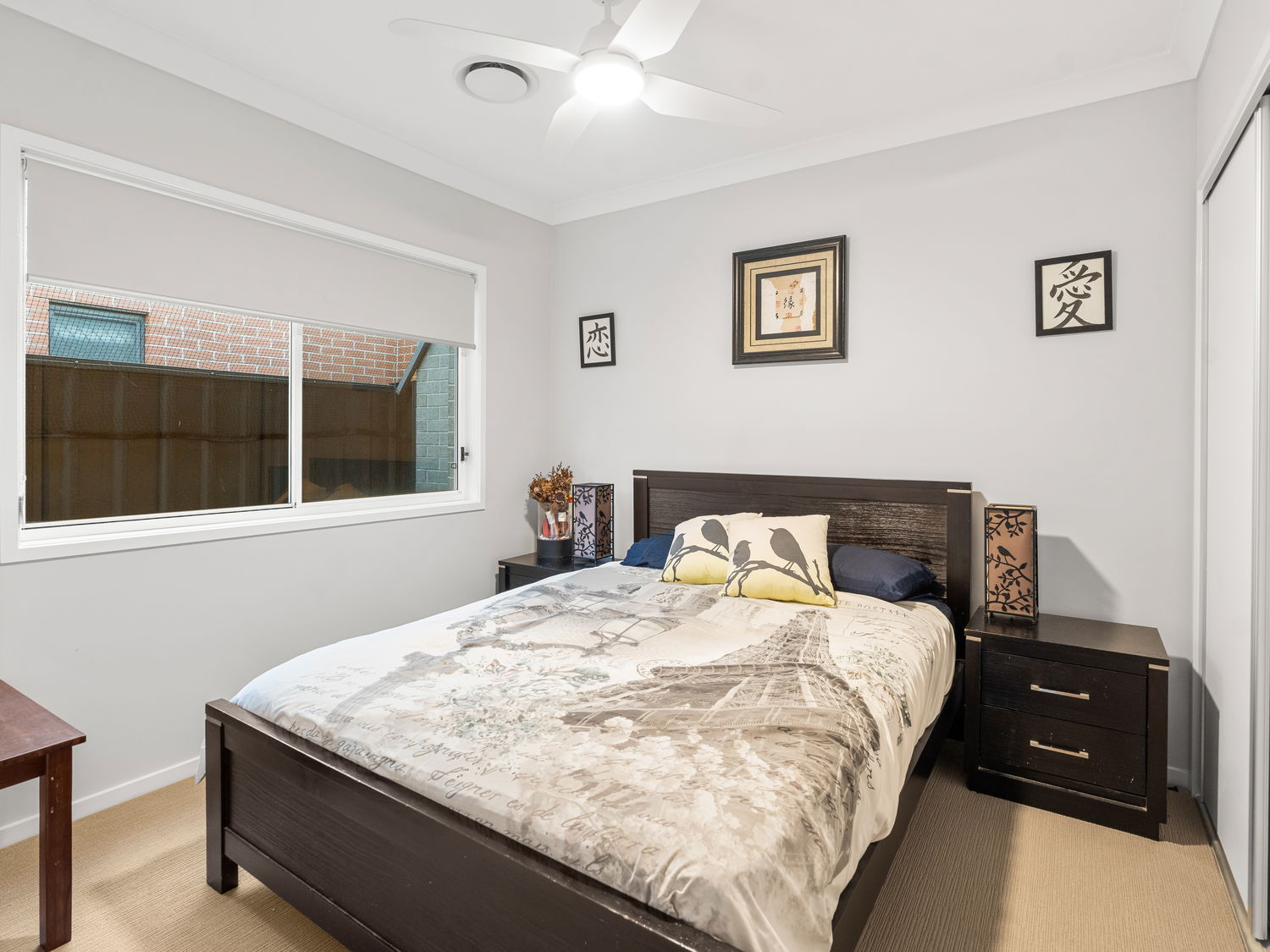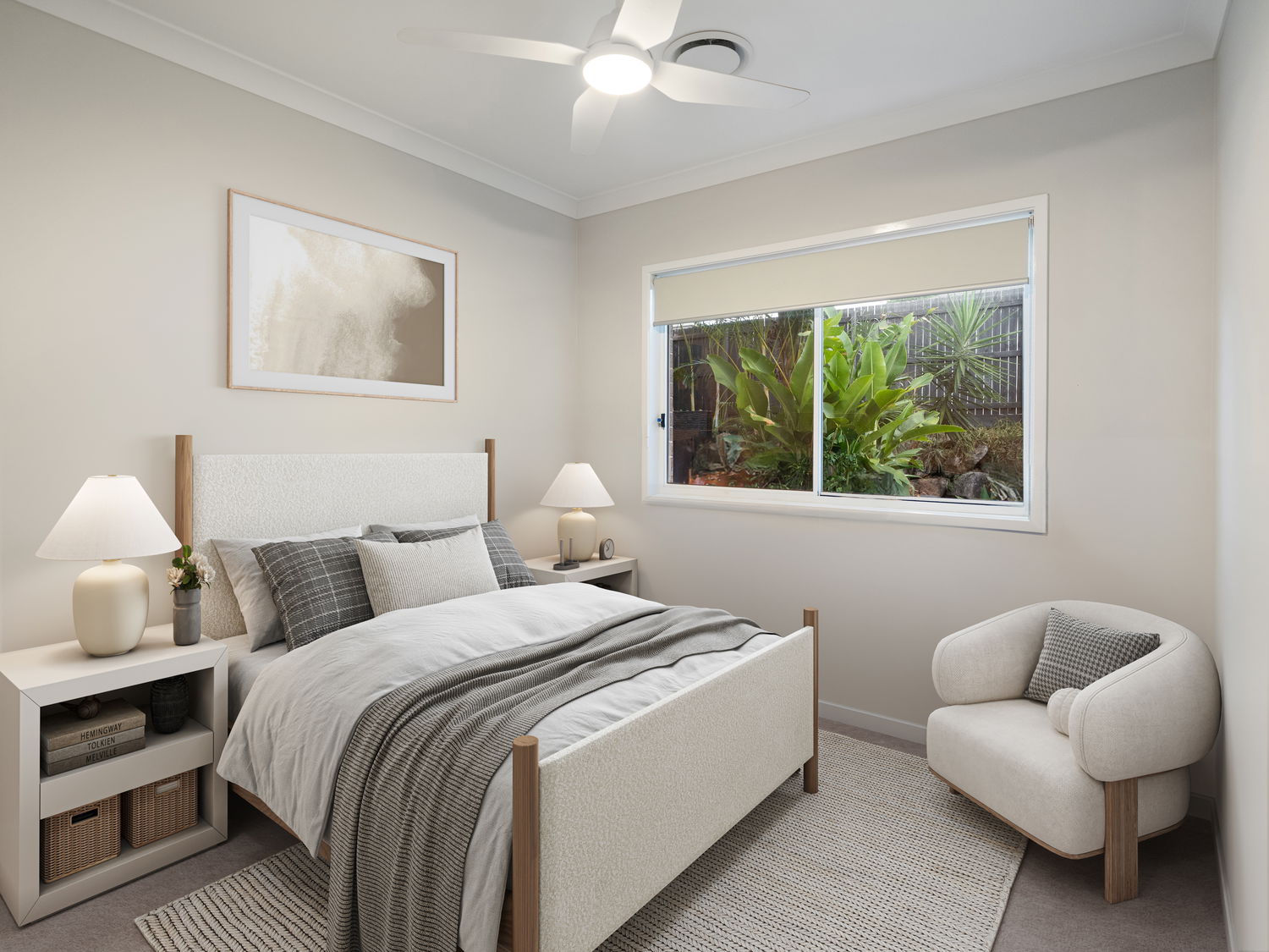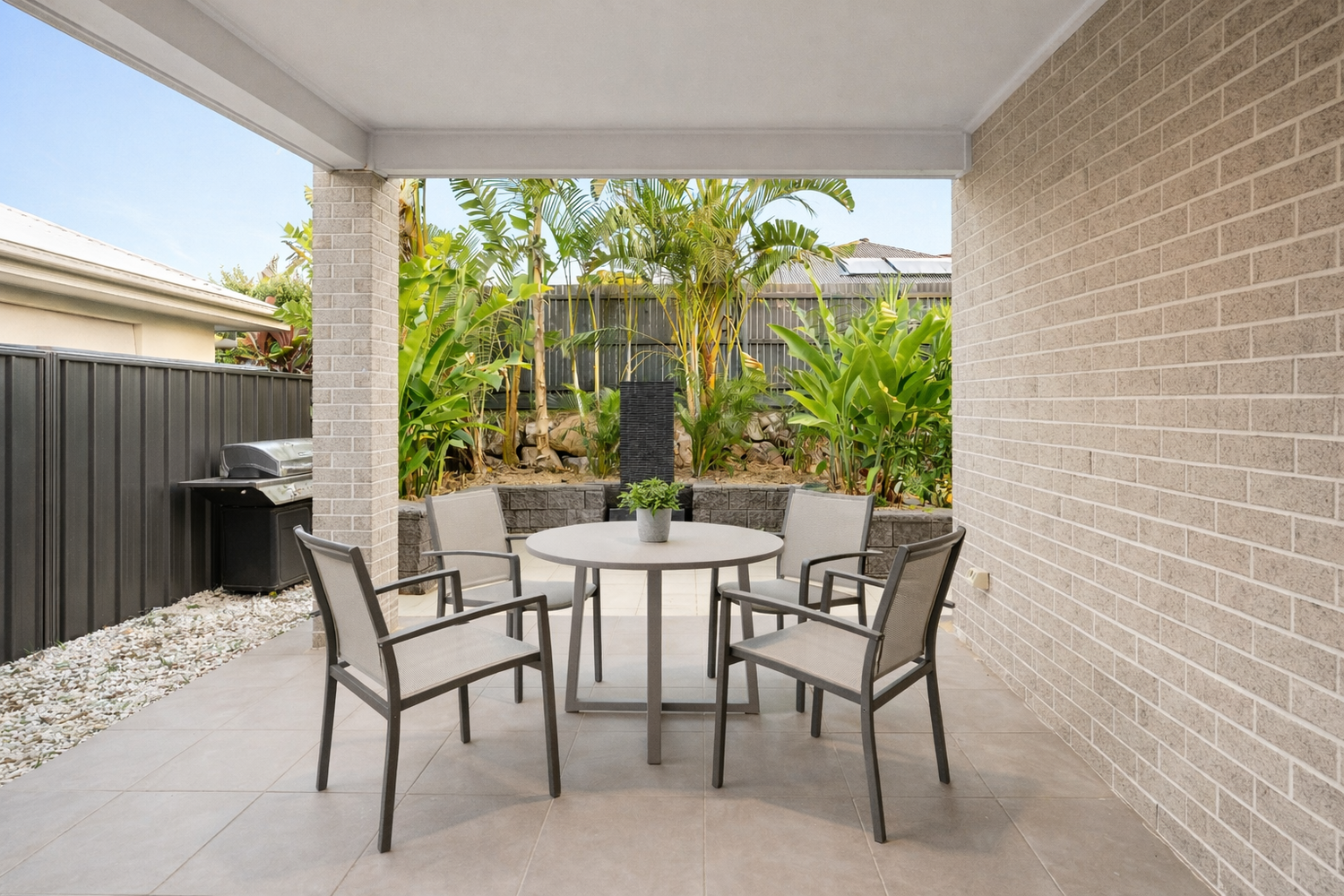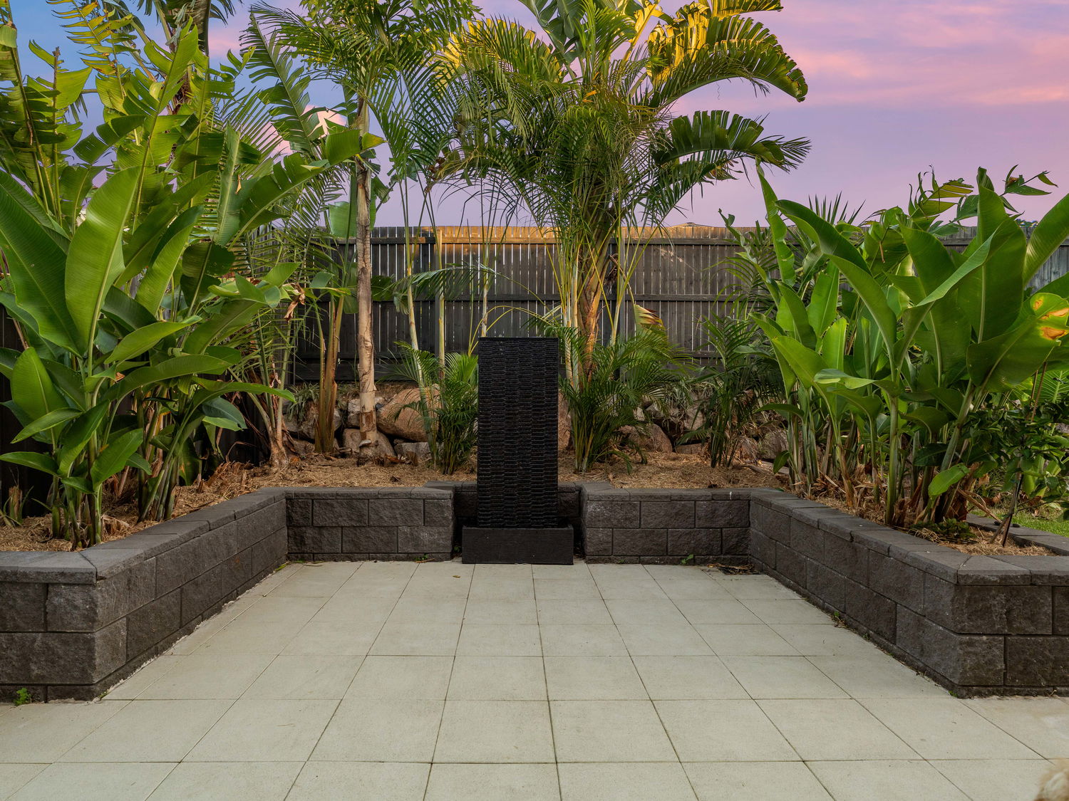 At the heart of the home, open-plan living and dining flows seamlessly from the kitchen through sliding doors to the covered alfresco. The kitchen is designed for both everyday living and entertaining, anchored by a stone island bench and complemented by quality finishes throughout. An office nook and large linen cupboard add practicality, while the outdoor zone is enhanced by an extended courtyard and water feature, creating a tranquil setting to unwind or entertain year-round.