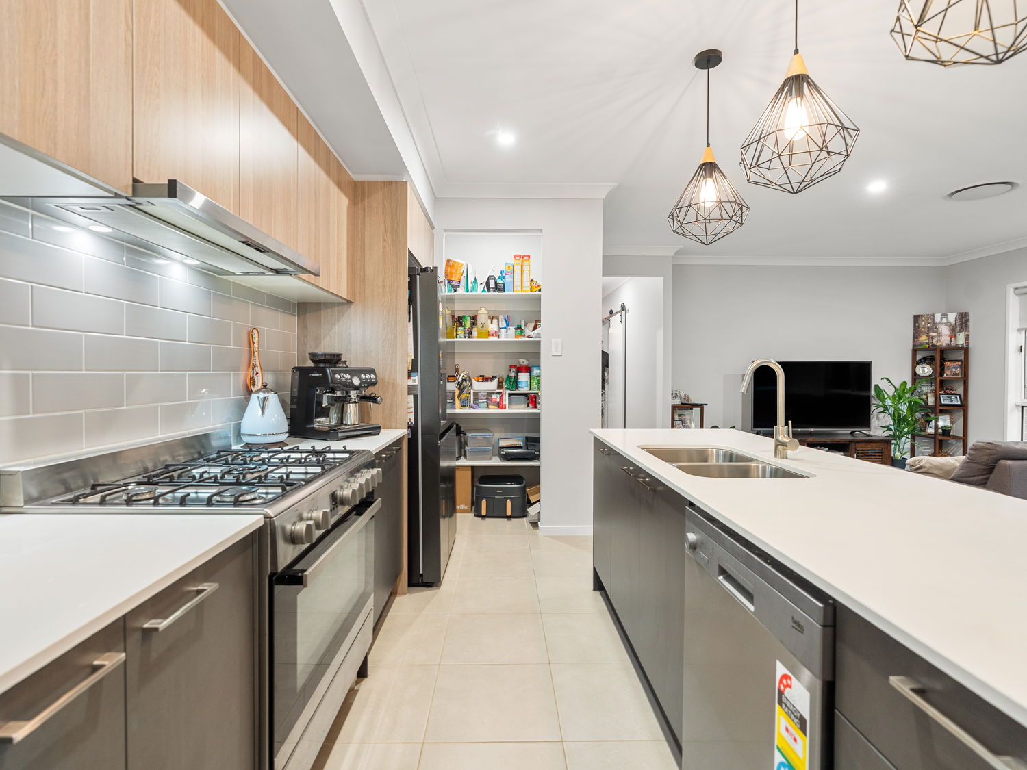 *Kitchen with stone benchtops, 900mm Westinghouse freestanding gas stove and large walk-in pantry