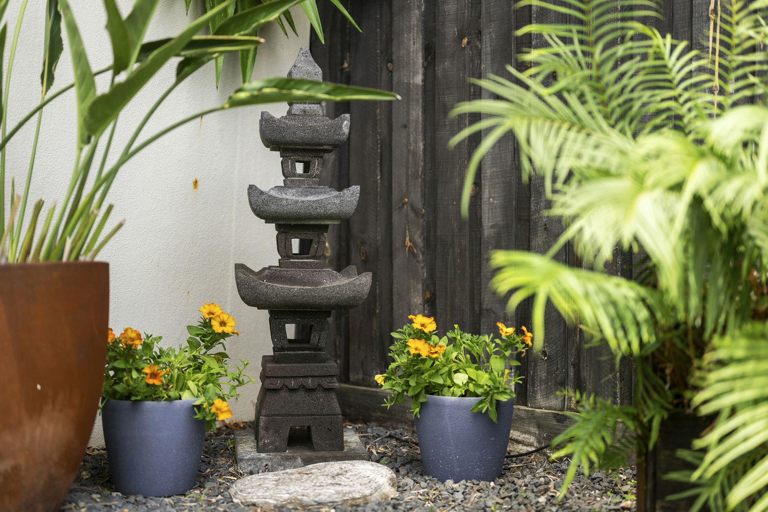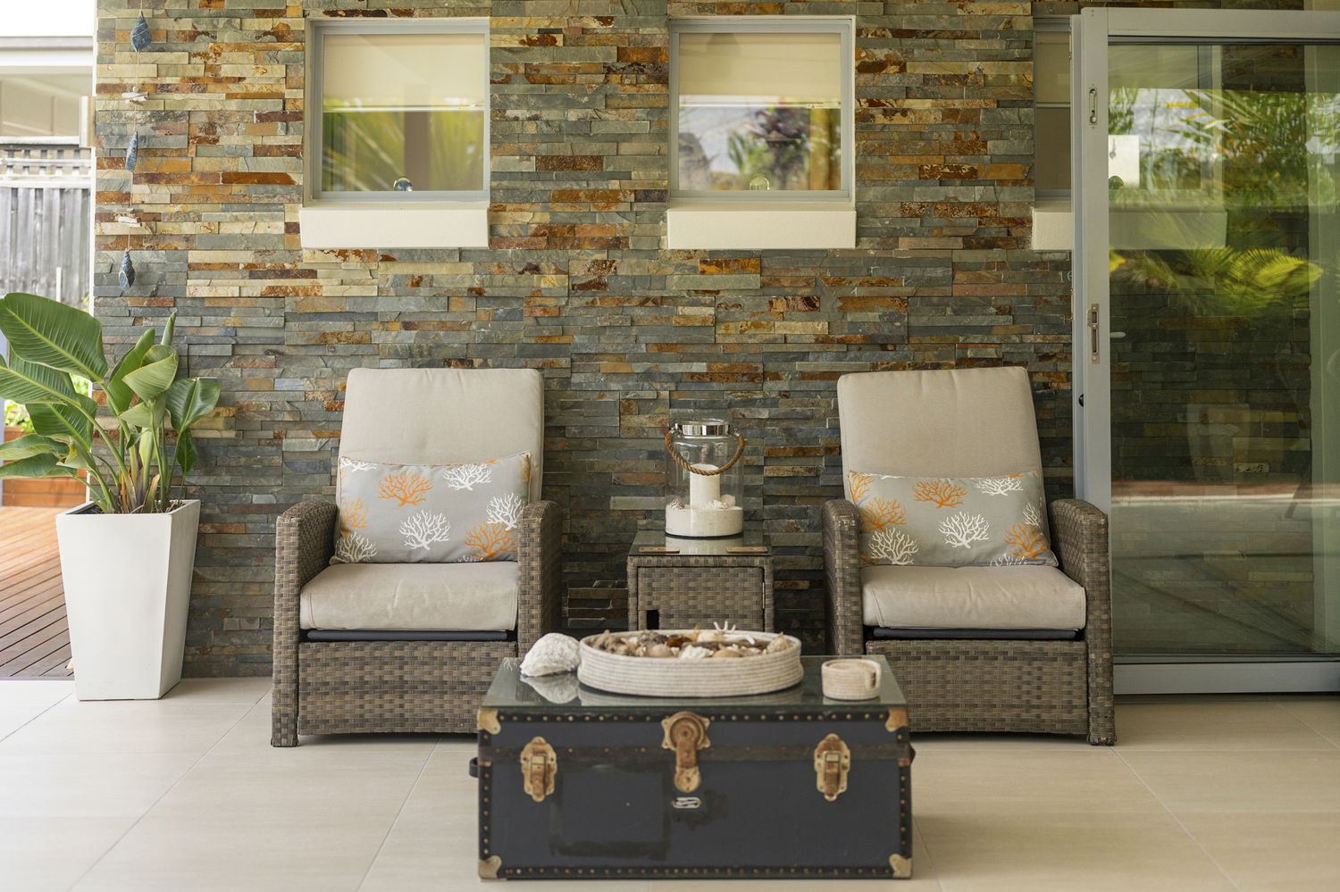 .Screen render wall enhanced by stacked stone inserts compliment the contemporary theme of the home