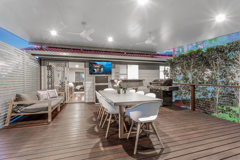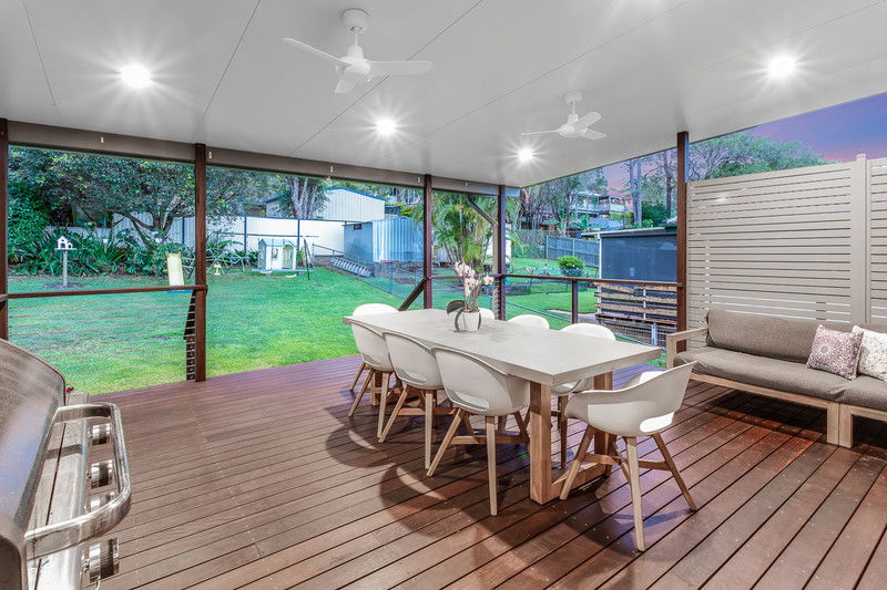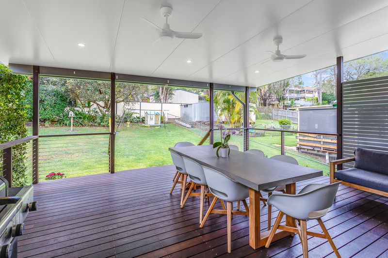 And then you step outside — and you get it. The large rear deck is the true hero here: covered, open, and set up for Queensland living with ceiling fans overhead and a beautiful outlook across the yard. It’s big enough to comfortably cater for a full outdoor setting, a BBQ zone, and still have room to move, making it ideal for long lunches, birthday parties, or simply winding down in the afternoons while the kids play. It’s the sort of space that changes how you live in a home, and it’s easy to see why it’s been such a favourite for the owners.