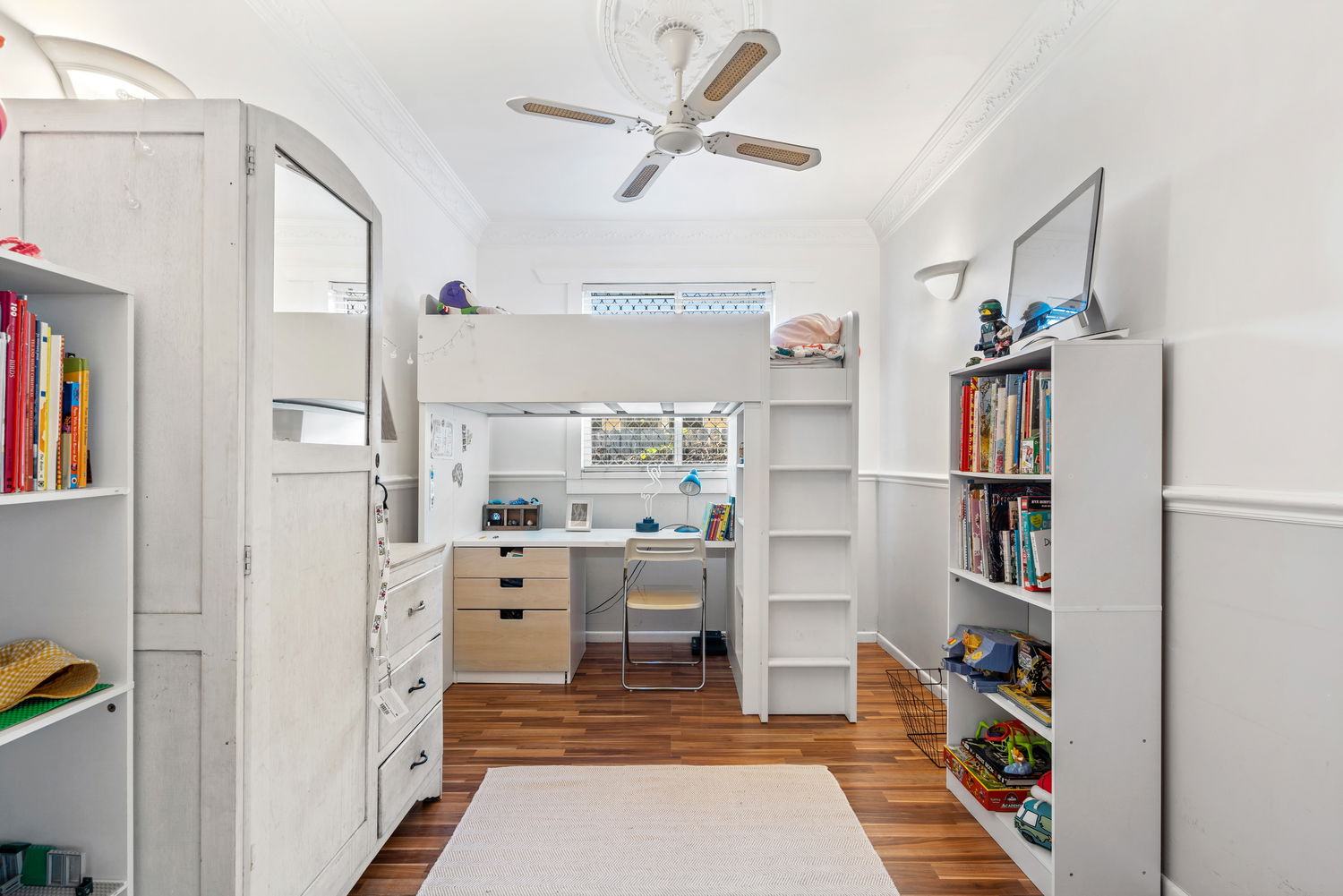 The master bedroom features a built in wardrobe, beautiful natural light and serviced by its art deco style ensuite.