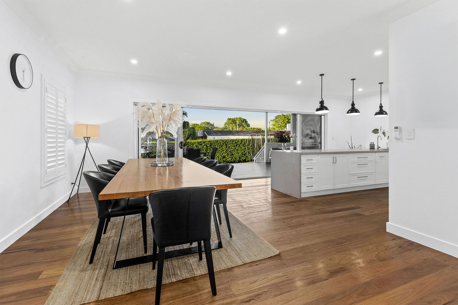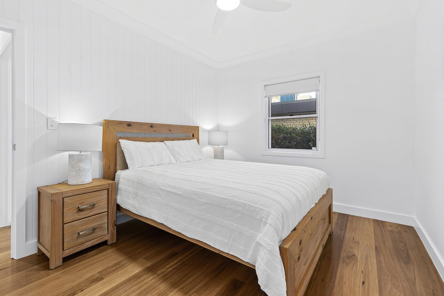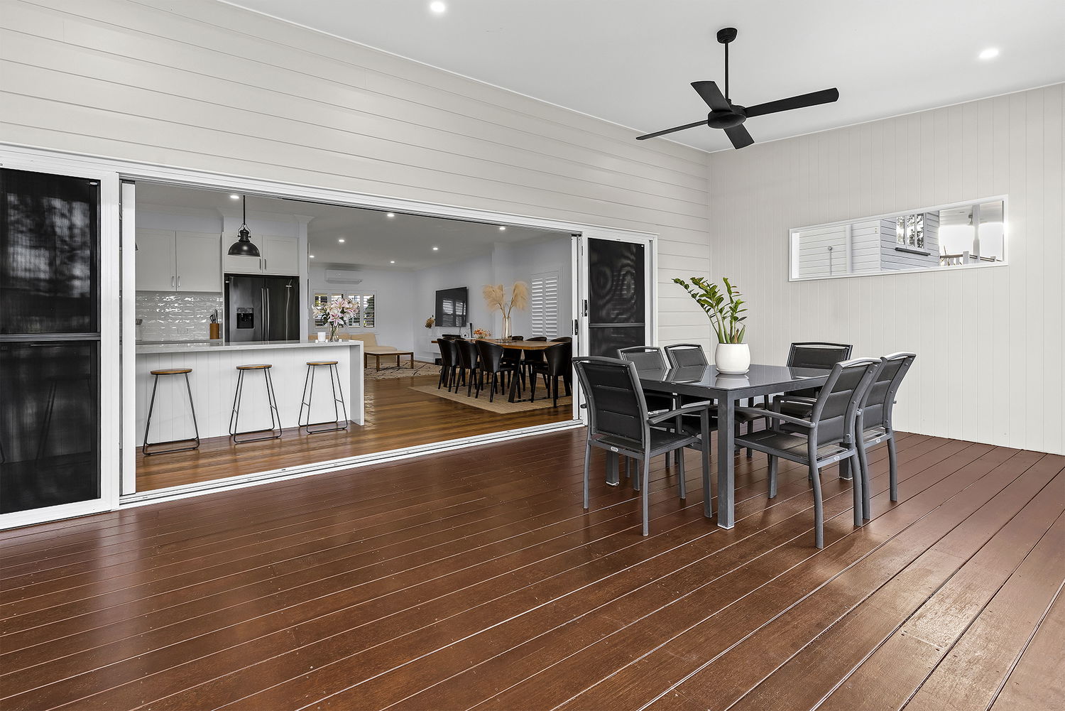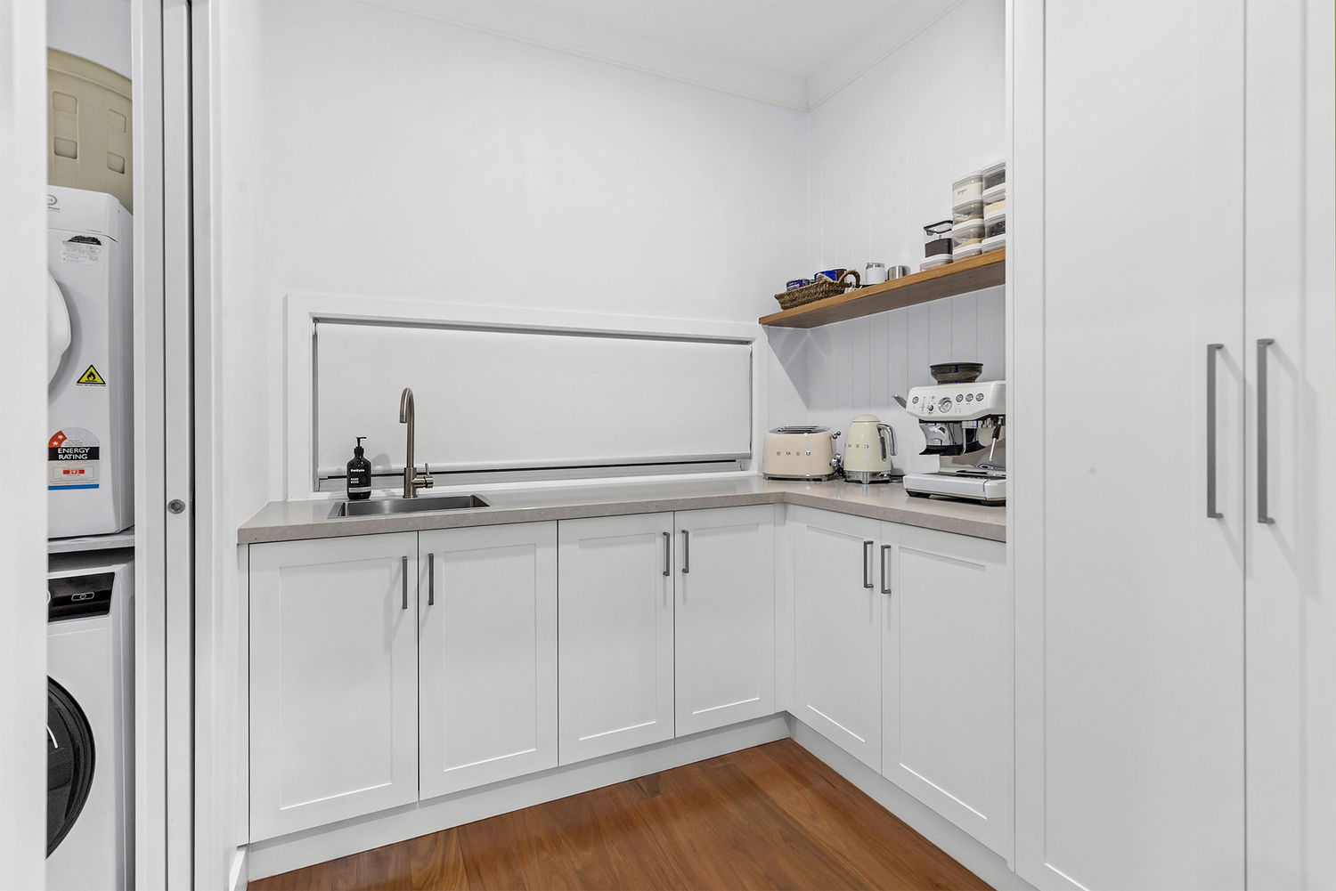 Framed by refreshing bay breezes and the scent of the sea, the home features polished Blackbutt timber floors, panelled walls, high ceilings and a soft coastal palette. Proudly built by Mair Constructions, the layout has been crafted for seamless everyday living and effortless entertaining.