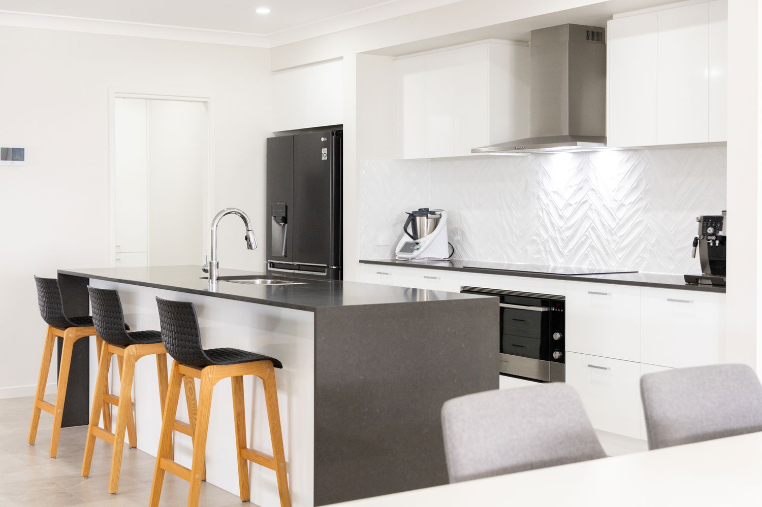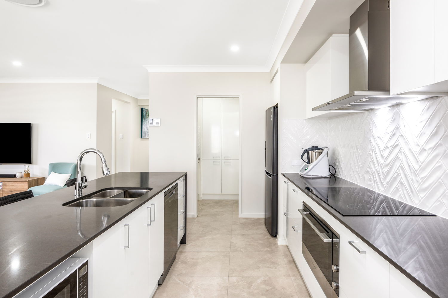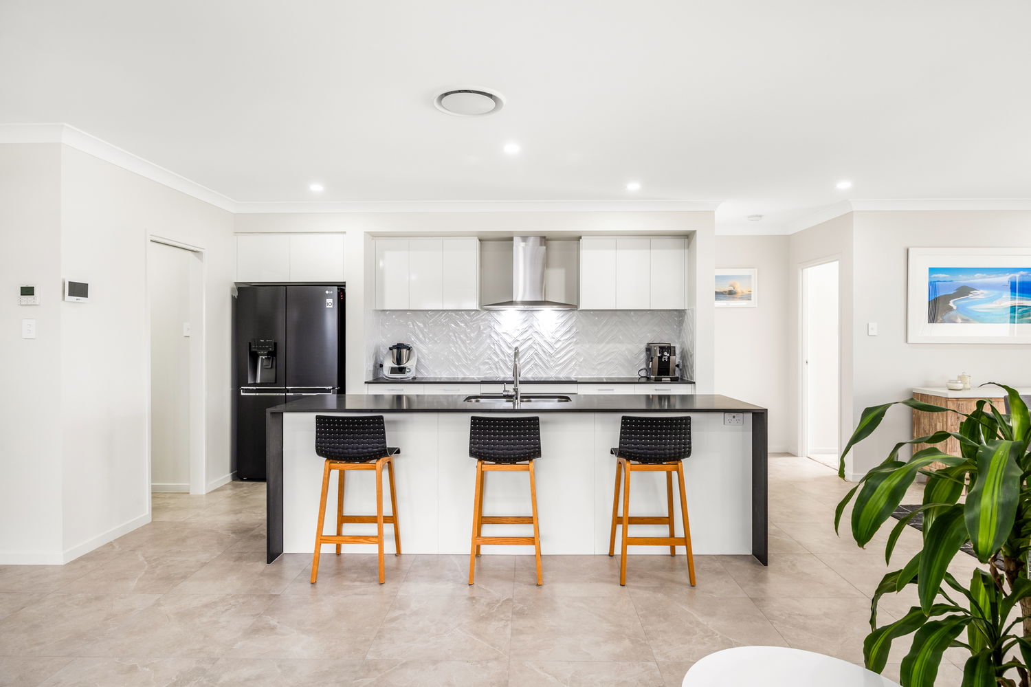 At the heart of the home is the sophisticated kitchen, featuring a bold black and white palette, quality stainless steel appliances, a butler’s pantry, and a breakfast bar—offering both style and practicality for everyday living and entertaining.
