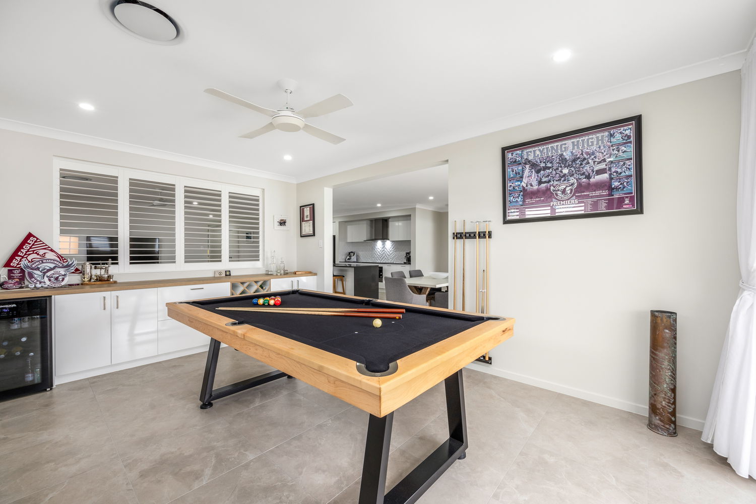Three additional bedrooms, all fitted with ceiling fans and built-in wardrobes, are positioned around a children’s retreat and a convenient study nook—perfect for homework or working from home.