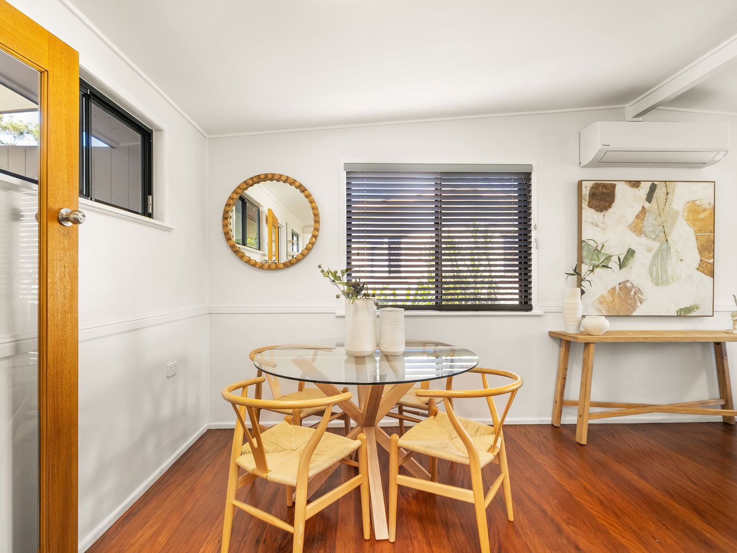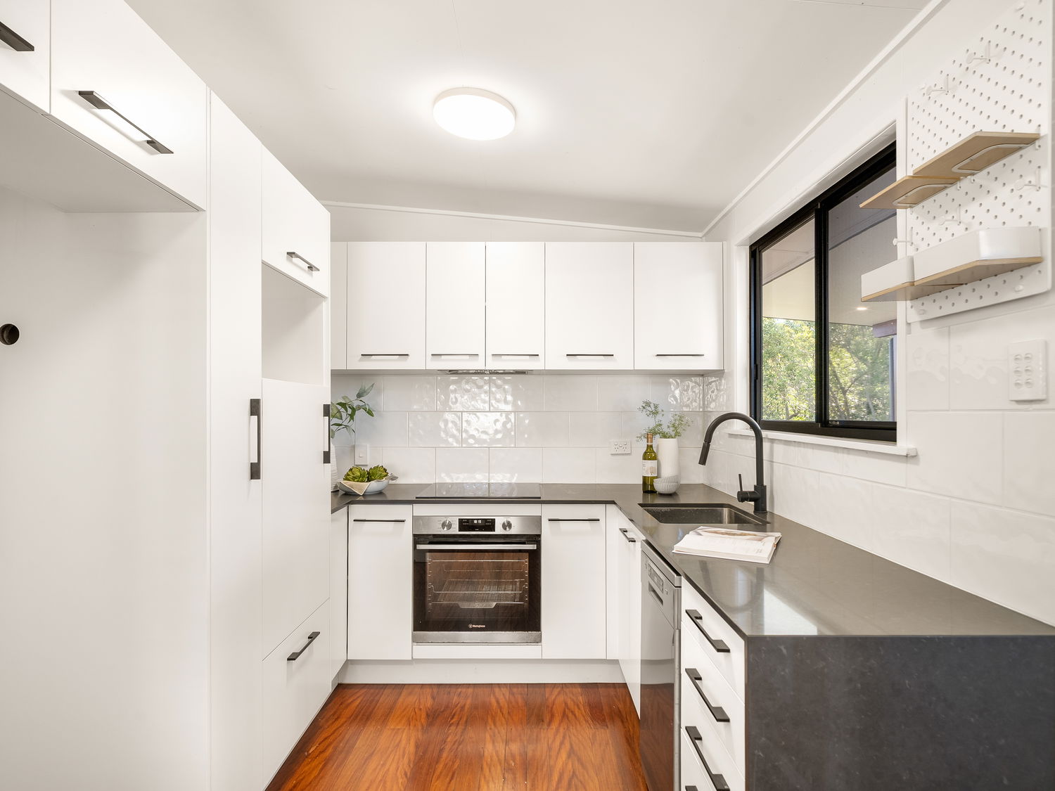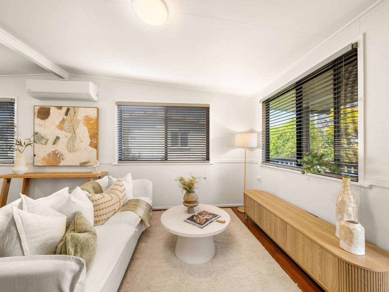 From the moment you arrive, the home’s elevated position and inviting street presence create an immediate sense of warmth. Step inside to discover a bright, open-plan layout designed for modern living, with air conditioning and ceiling fans ensuring year-round comfort. The spacious living and dining area flows seamlessly to a stylish, renovated kitchen featuring quality appliances, ample cabinetry, sleek tiled splashbacks, and generous bench space — the perfect setting for family meals and entertaining guests.