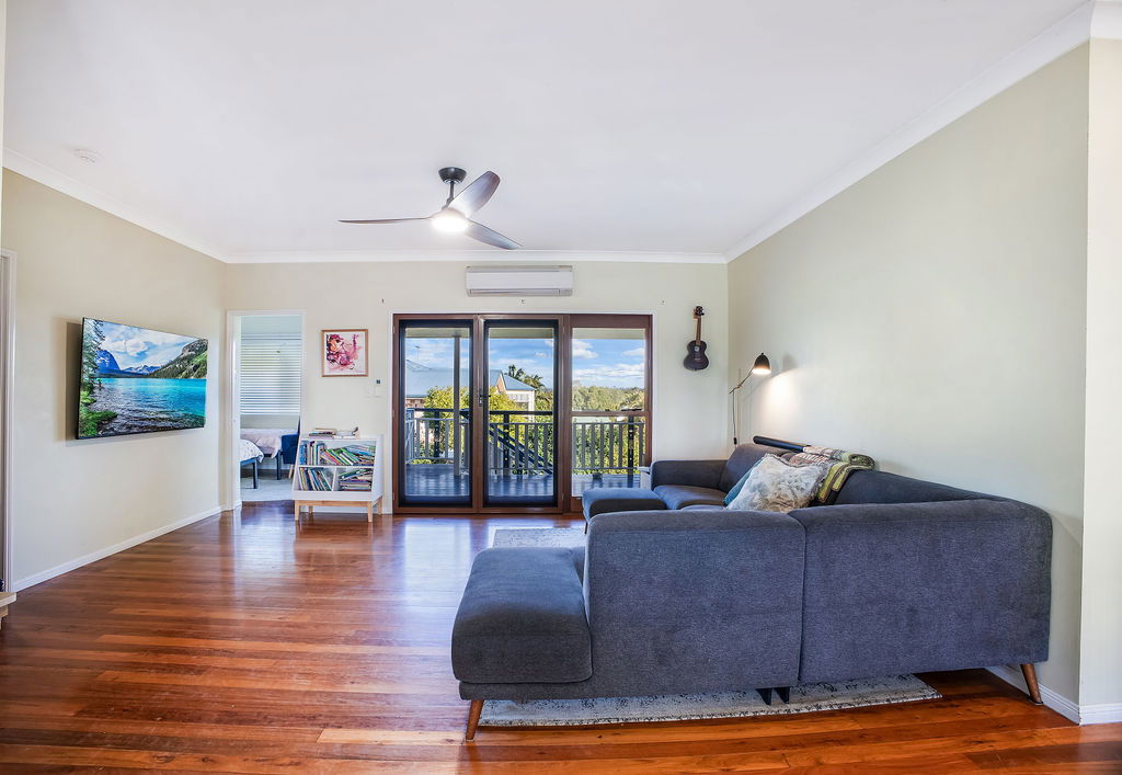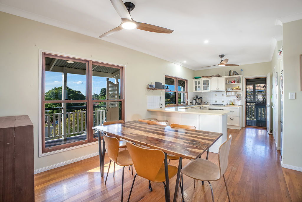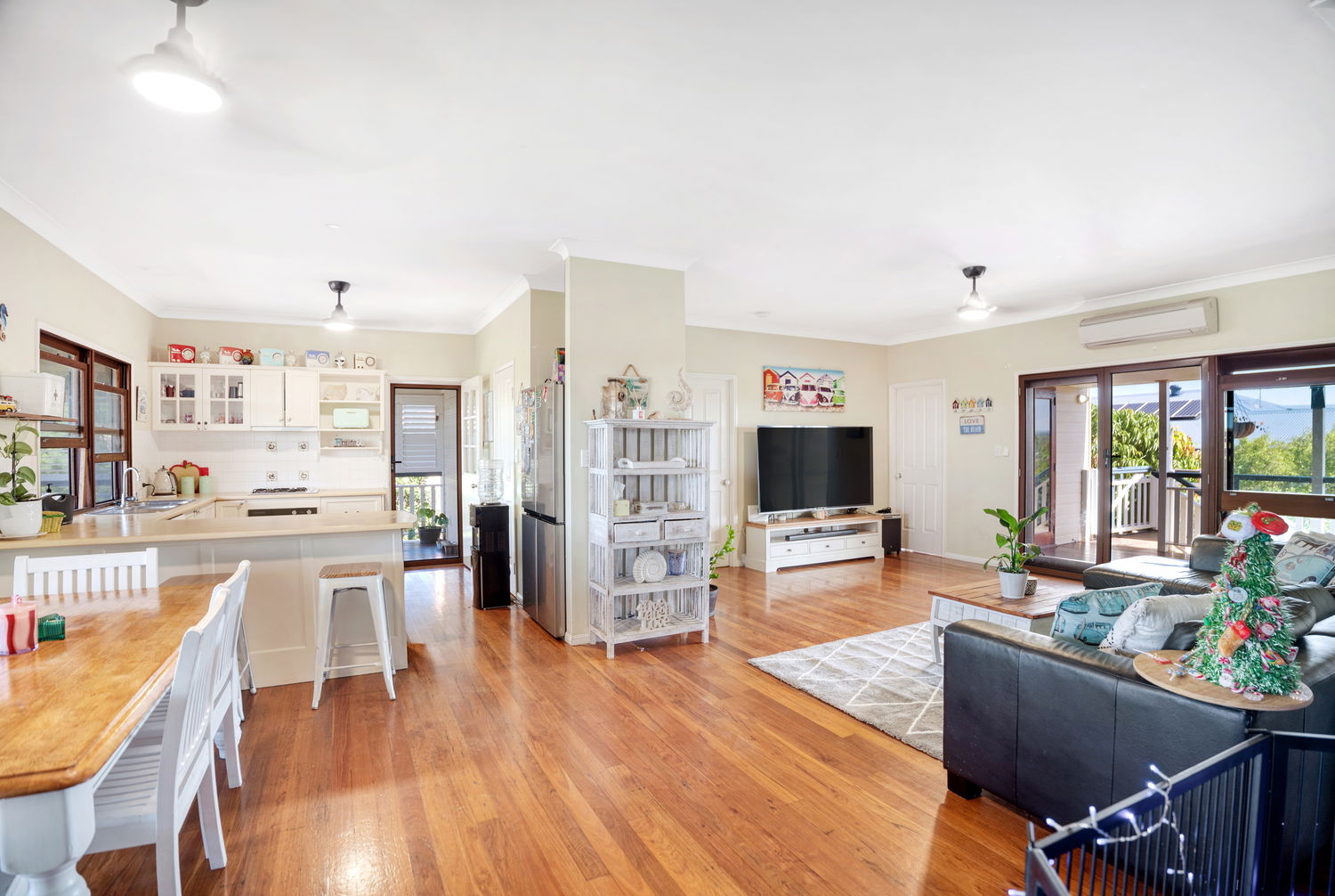 # Spacious open plan living and dining with high ceilings, polished floorboards, ceiling fans and air-conditioning