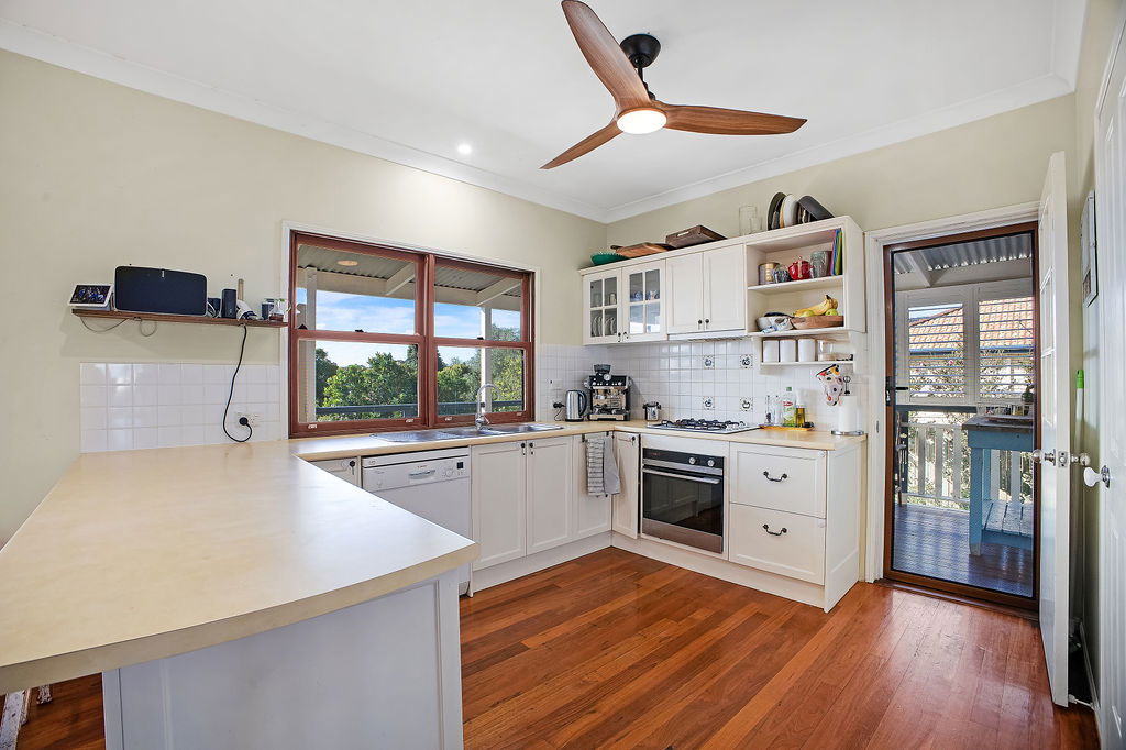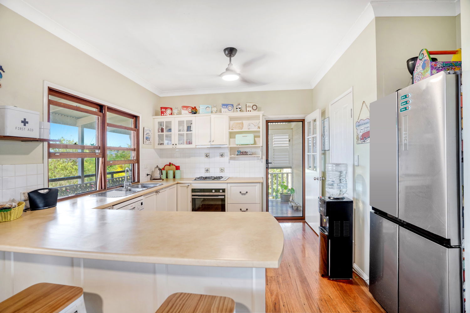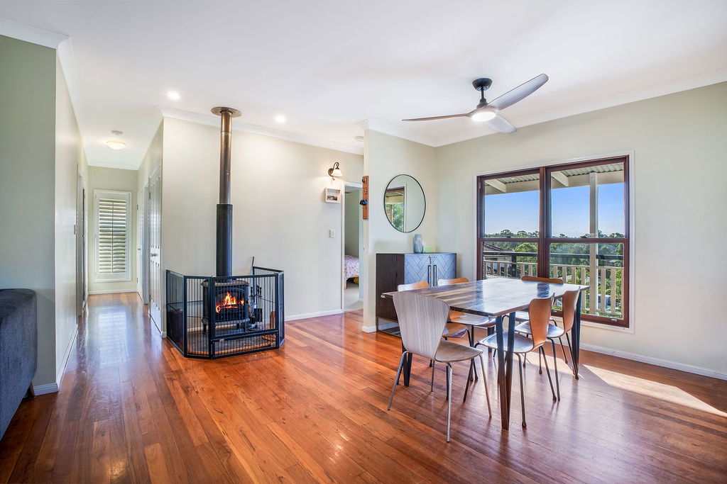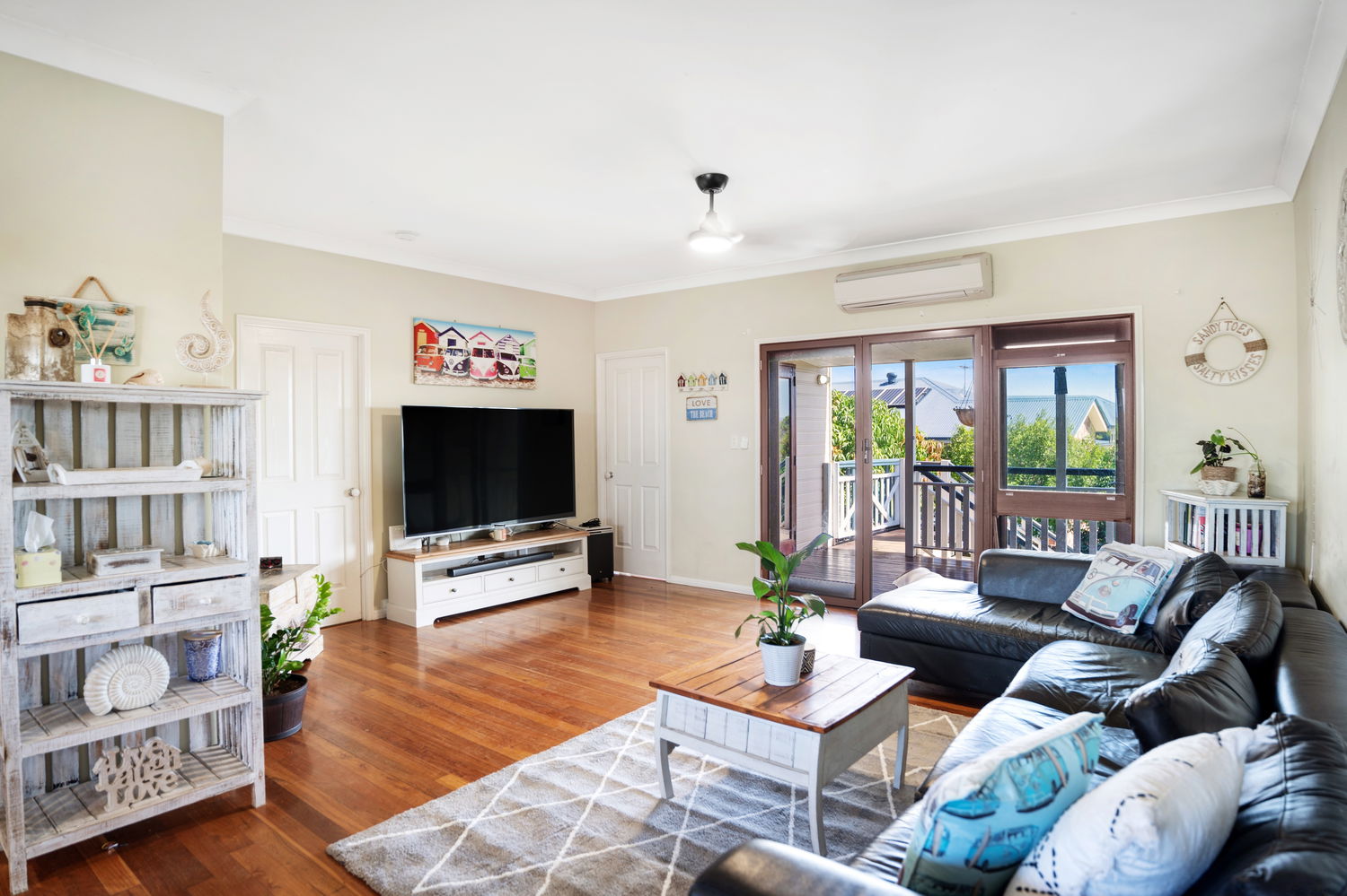 # Spacious open plan living and dining with high ceilings, polished floorboards, ceiling fans and air-conditioning