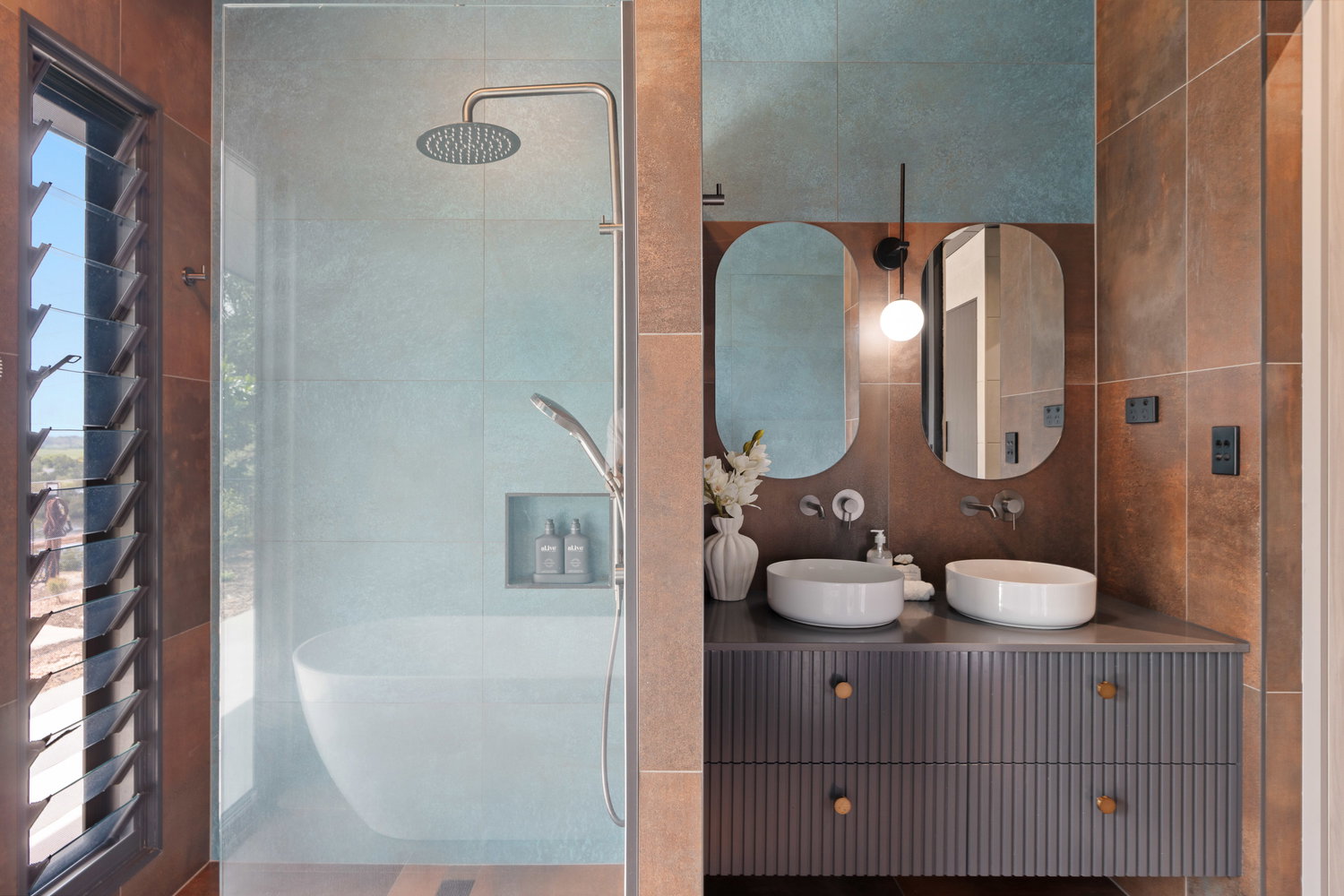 Outdoors, multiple tiled alfresco zones, a heated outdoor shower, custom pool fencing and a bespoke firepit with gabion seating create an environment designed for entertaining and relaxation. Granite boulder seating and thoughtfully placed landscape elements complete the setting, offering a perfect balance between design and nature.