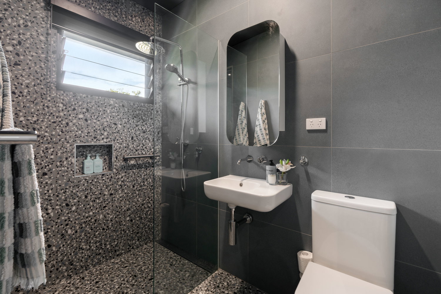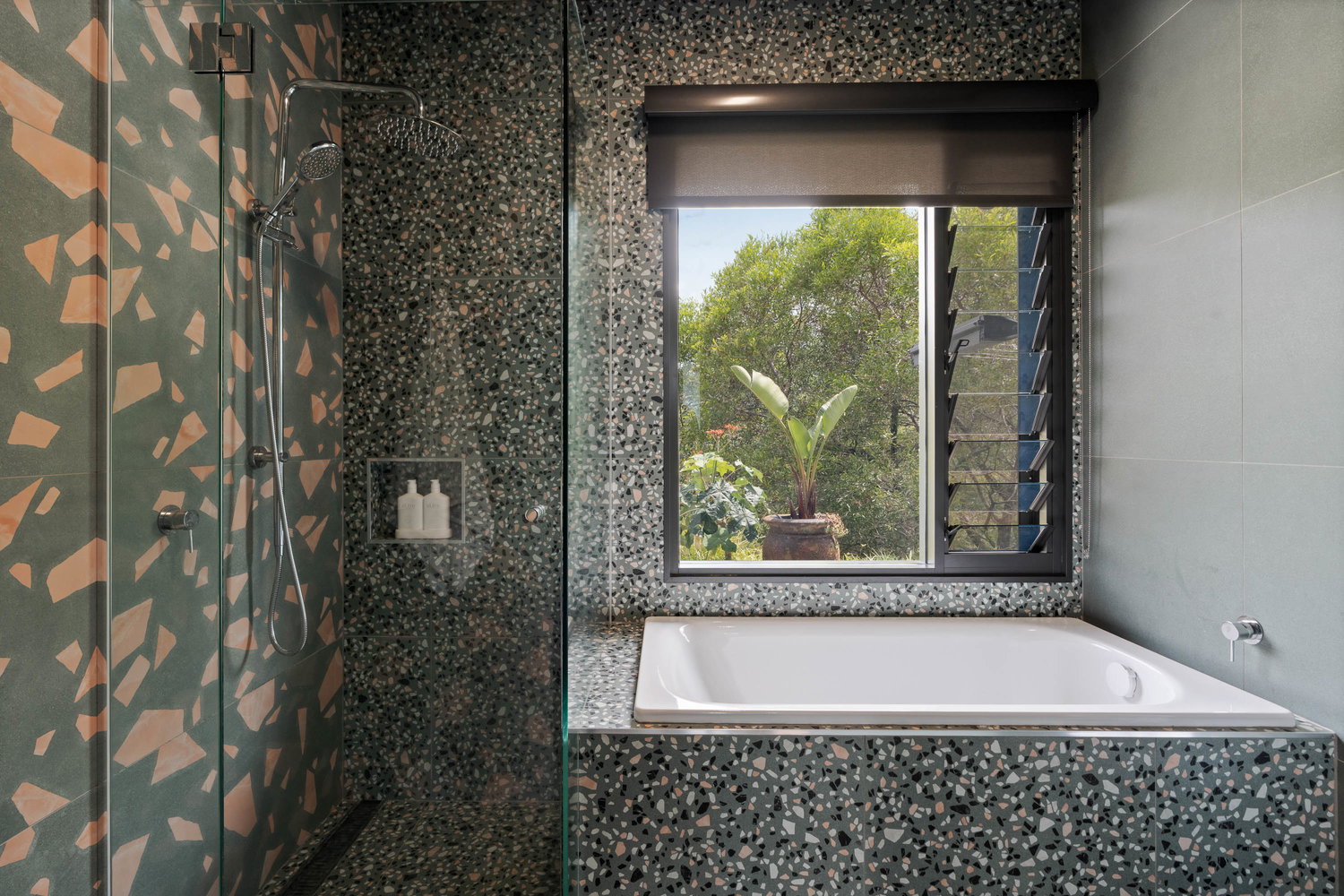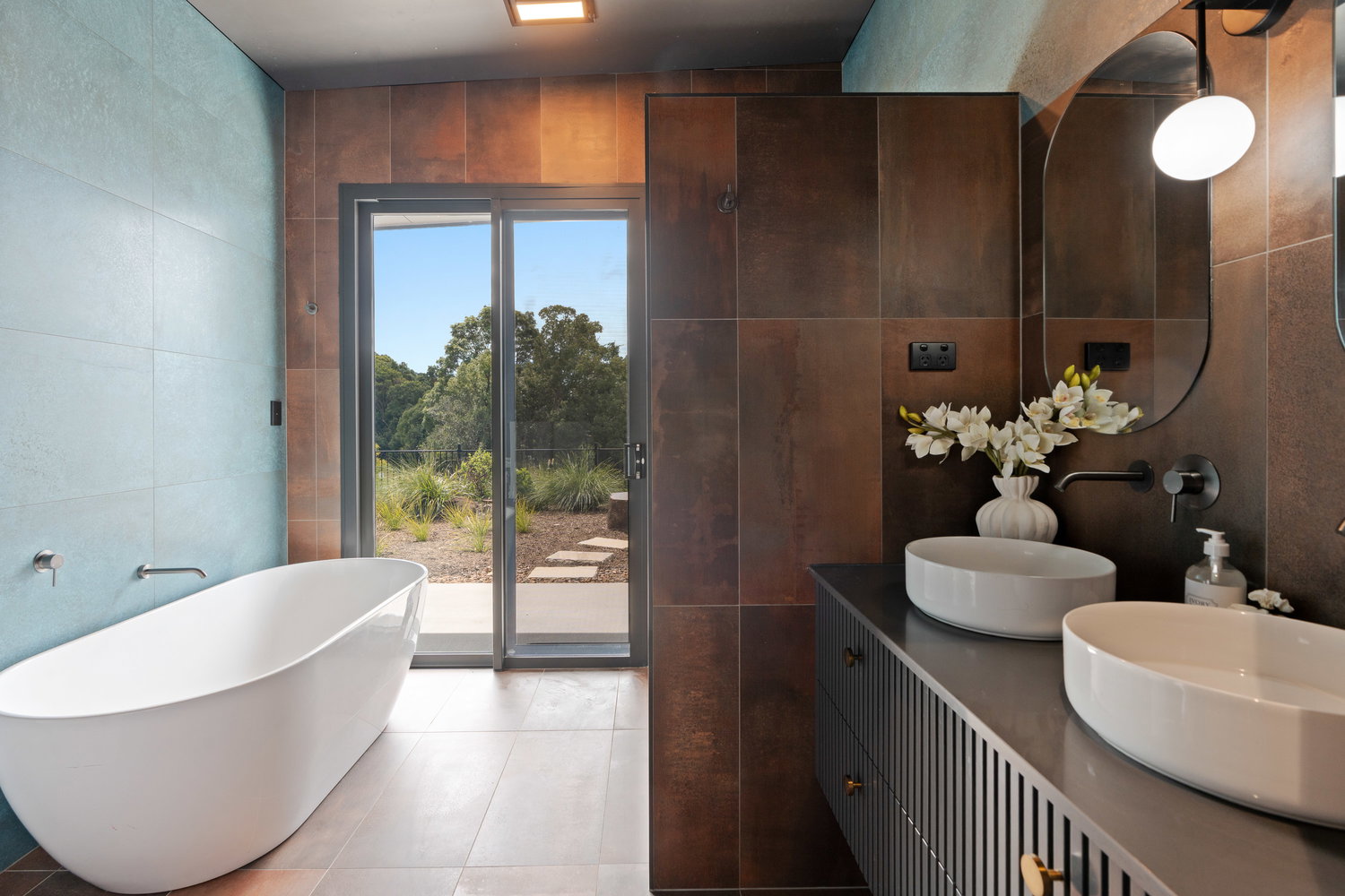 Accommodation comprises four generous bedrooms, including two luxurious suites. The primary retreat offers a private sanctuary with walk in robe, designer ensuite with Italian tiling and a freestanding bath, all enhanced by tranquil outlooks. A guest suite also features its own walk in robe and ensuite, while the remaining bedrooms are well appointed with built in storage, air conditioning and ceiling fans.