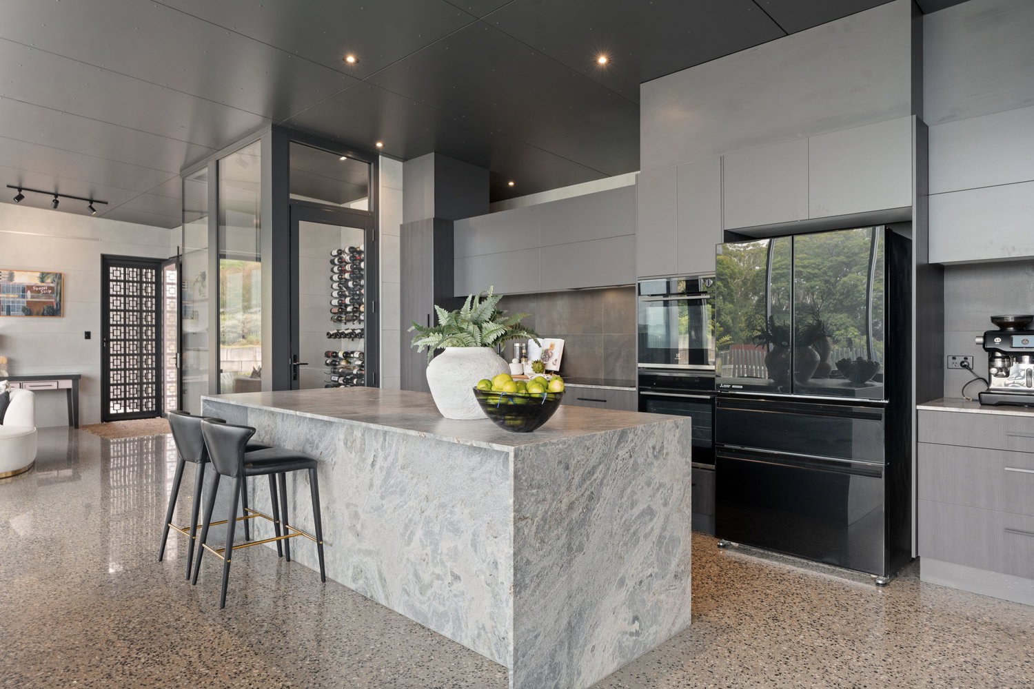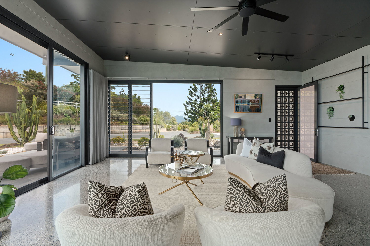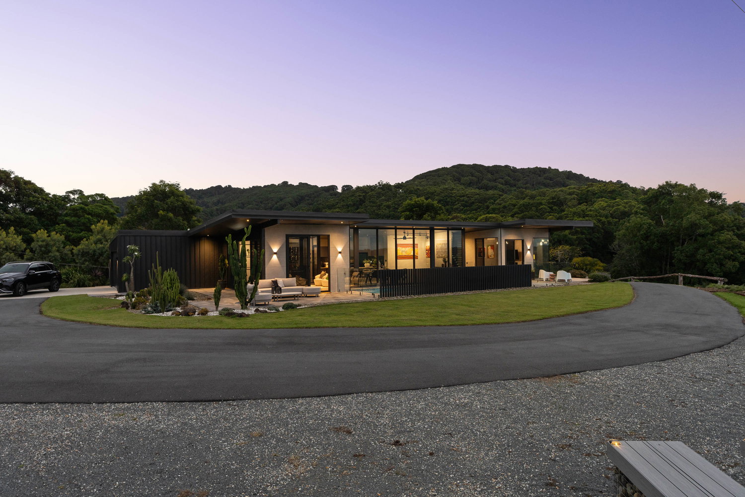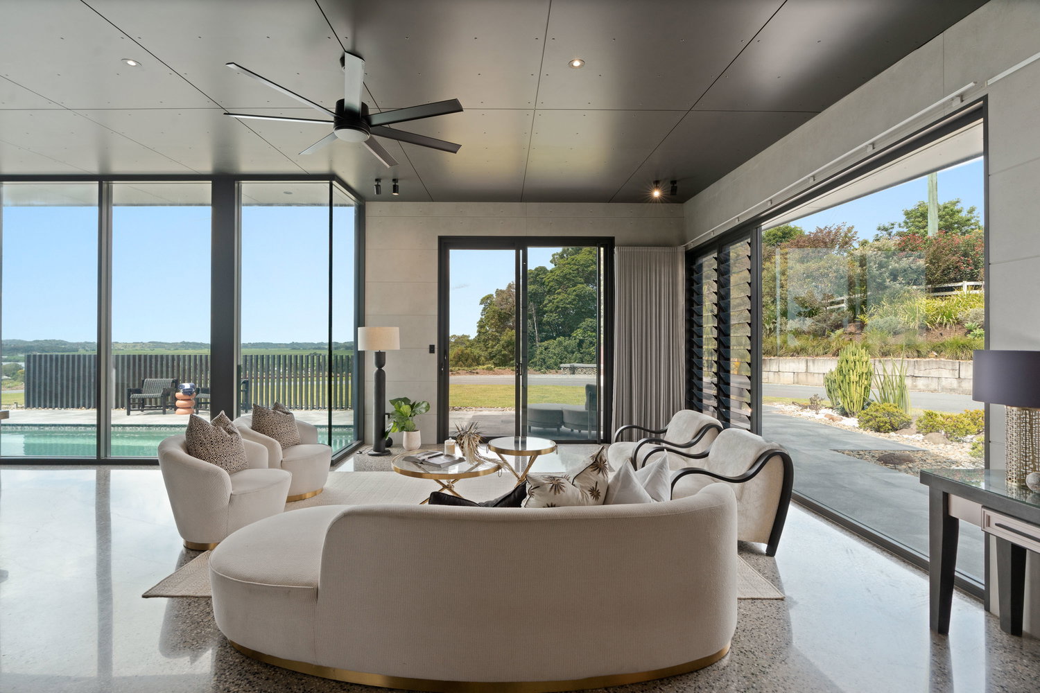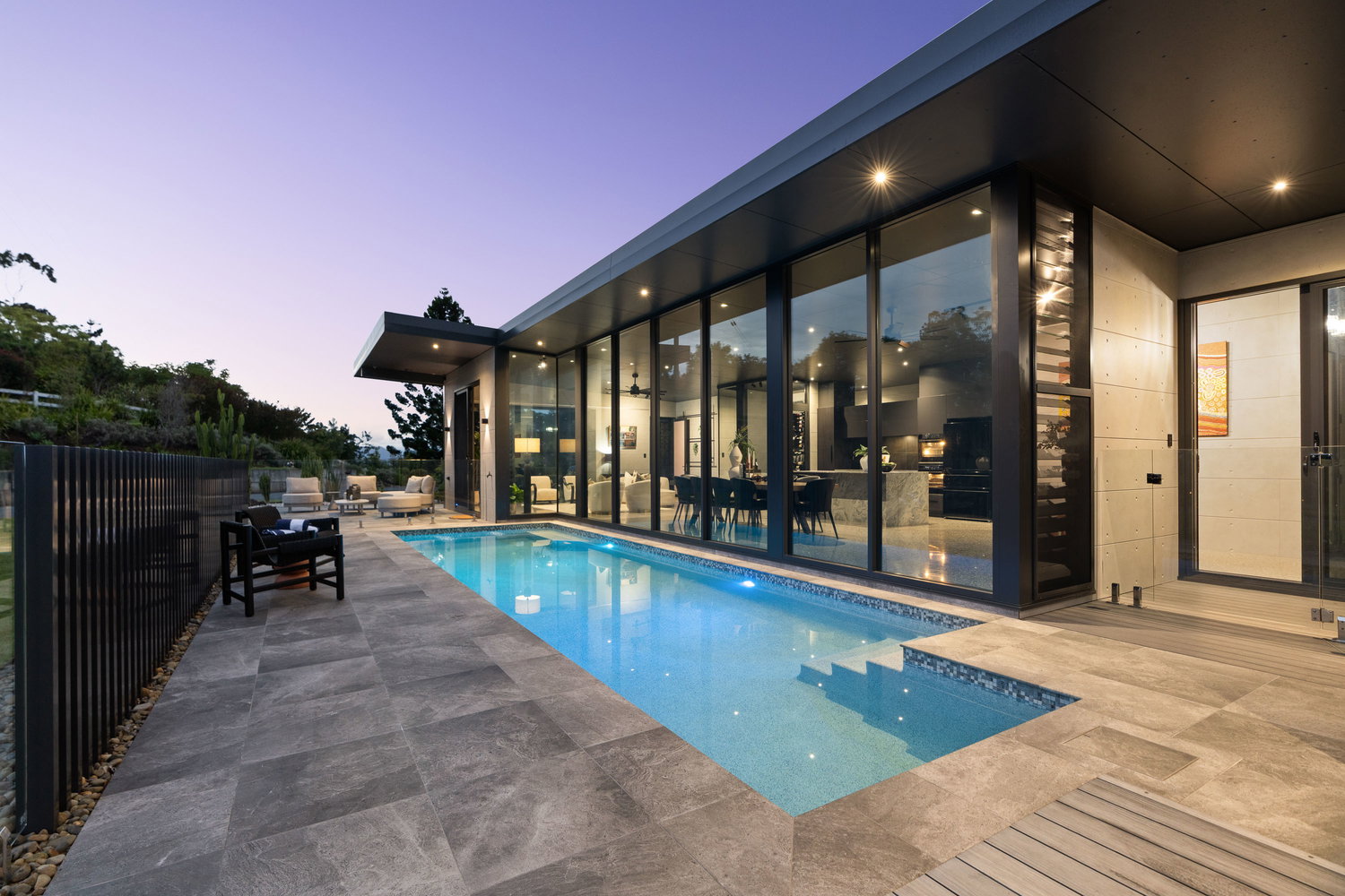 The main residence is a bold statement in contemporary design, defined by its clean lines, premium materials and no plaster, no paint construction, ensuring both visual impact and enduring quality. Inside, expansive open plan living, dining and kitchen zones are bathed in natural light, with polished concrete floors and extensive glazing drawing your eye directly to the breathtaking outlook. The scale is impressive, yet the connection to the outdoors remains seamless, flowing effortlessly to a resort style entertaining area centred around a heated magnesium swimming pool.