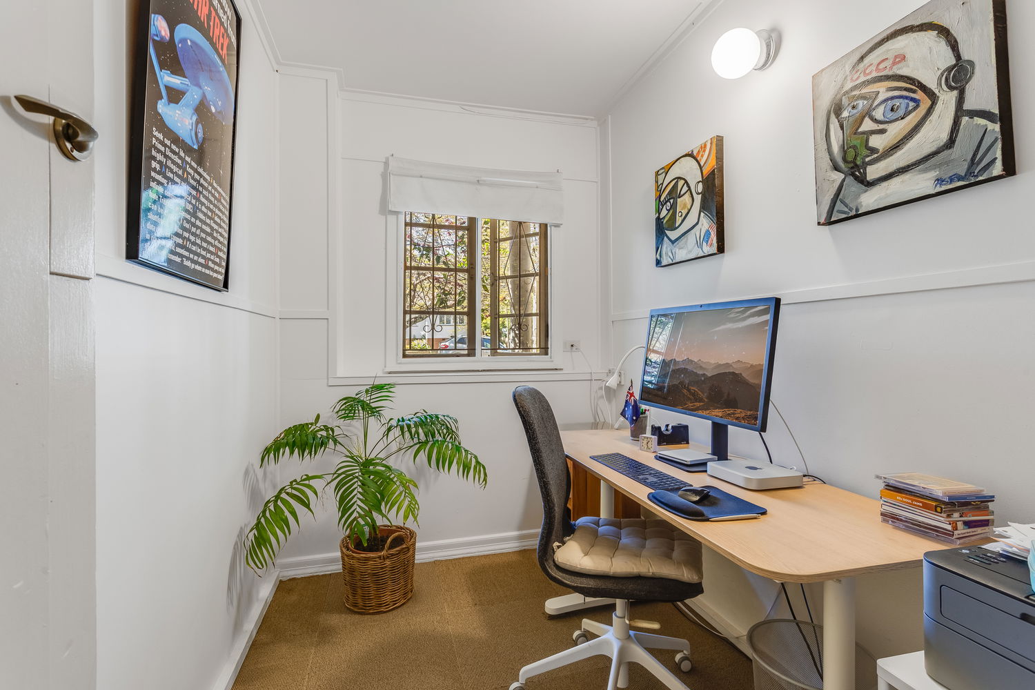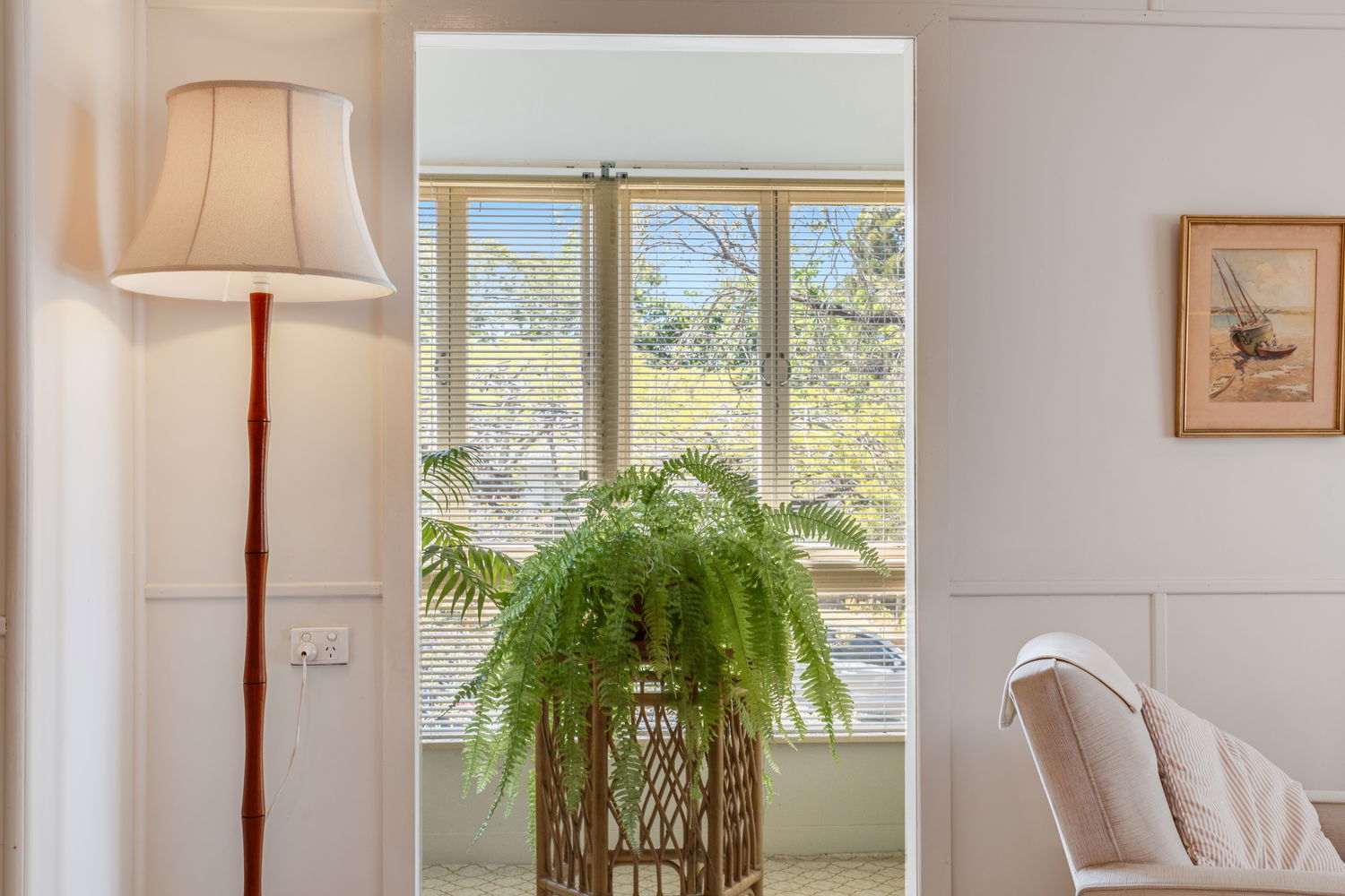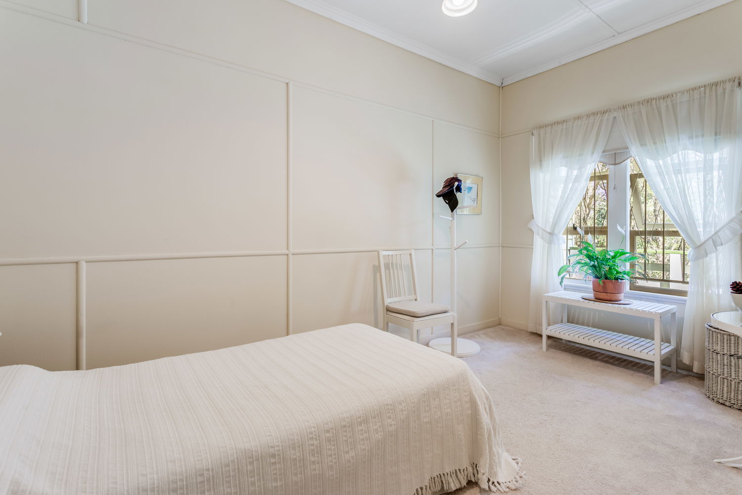 Also on this level is the queen-sized, carpeted main bedroom that enjoys streetscape views. The main bathroom and a separate toilet and laundry adjoins, and is flanked by a bright and airy carpeted, single bedroom, also with high windows and leafy views.