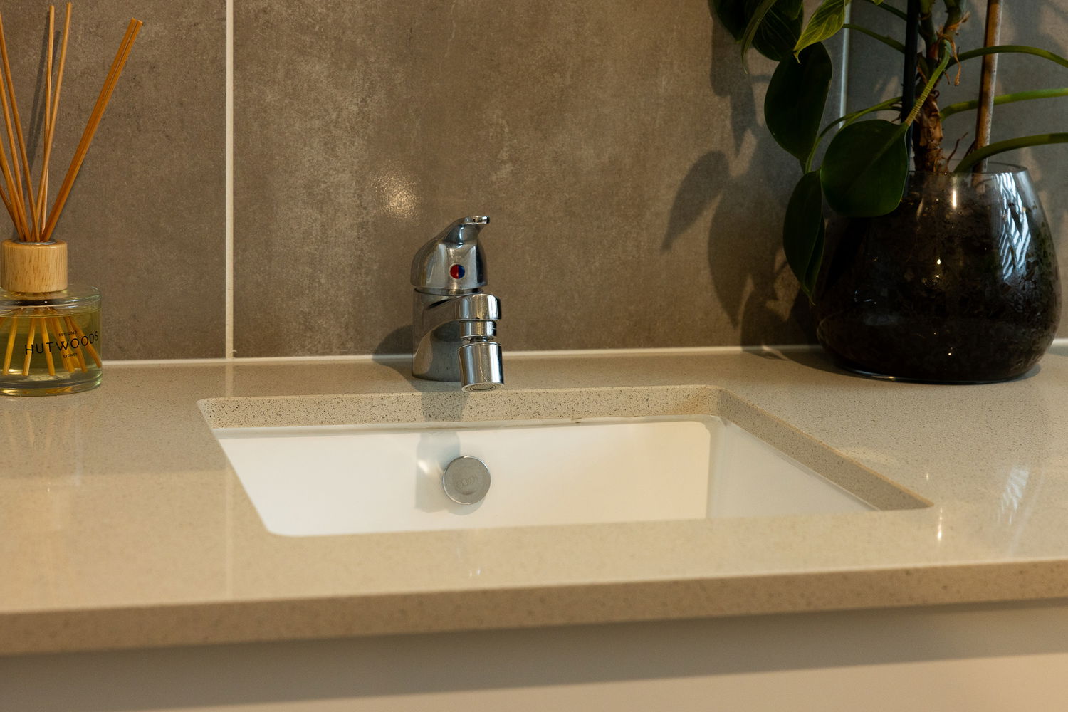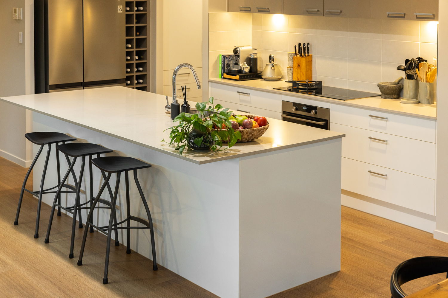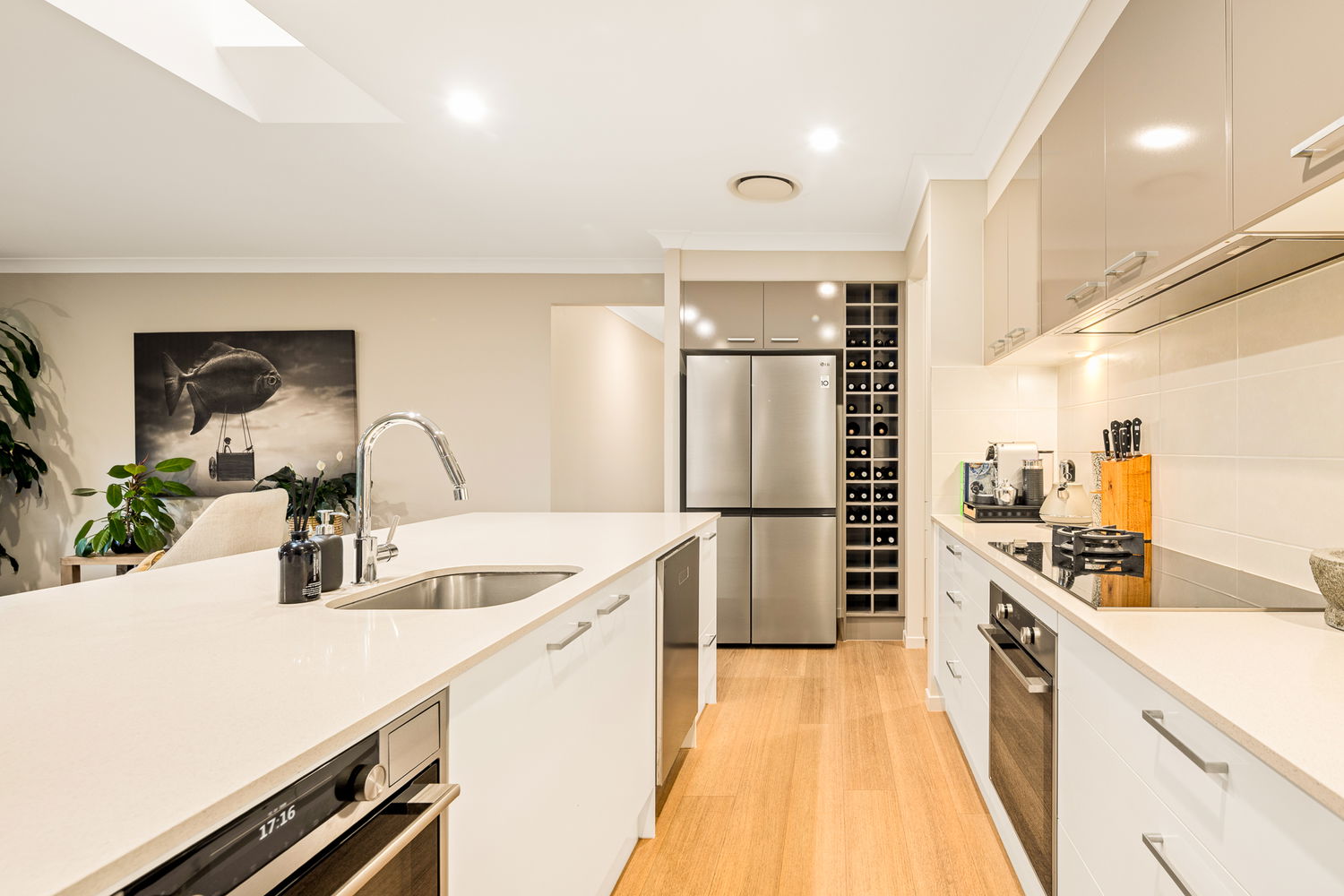 At the heart of the residence lies the luxury chef’s kitchen, featuring an XL stone island bench, walk-in pantry, and a suite of premium Asko appliances — including an induction cooktop, combo steam oven, and pyrolytic oven. A skylight overhead illuminates the space, enhancing the home’s modern, airy ambience.
