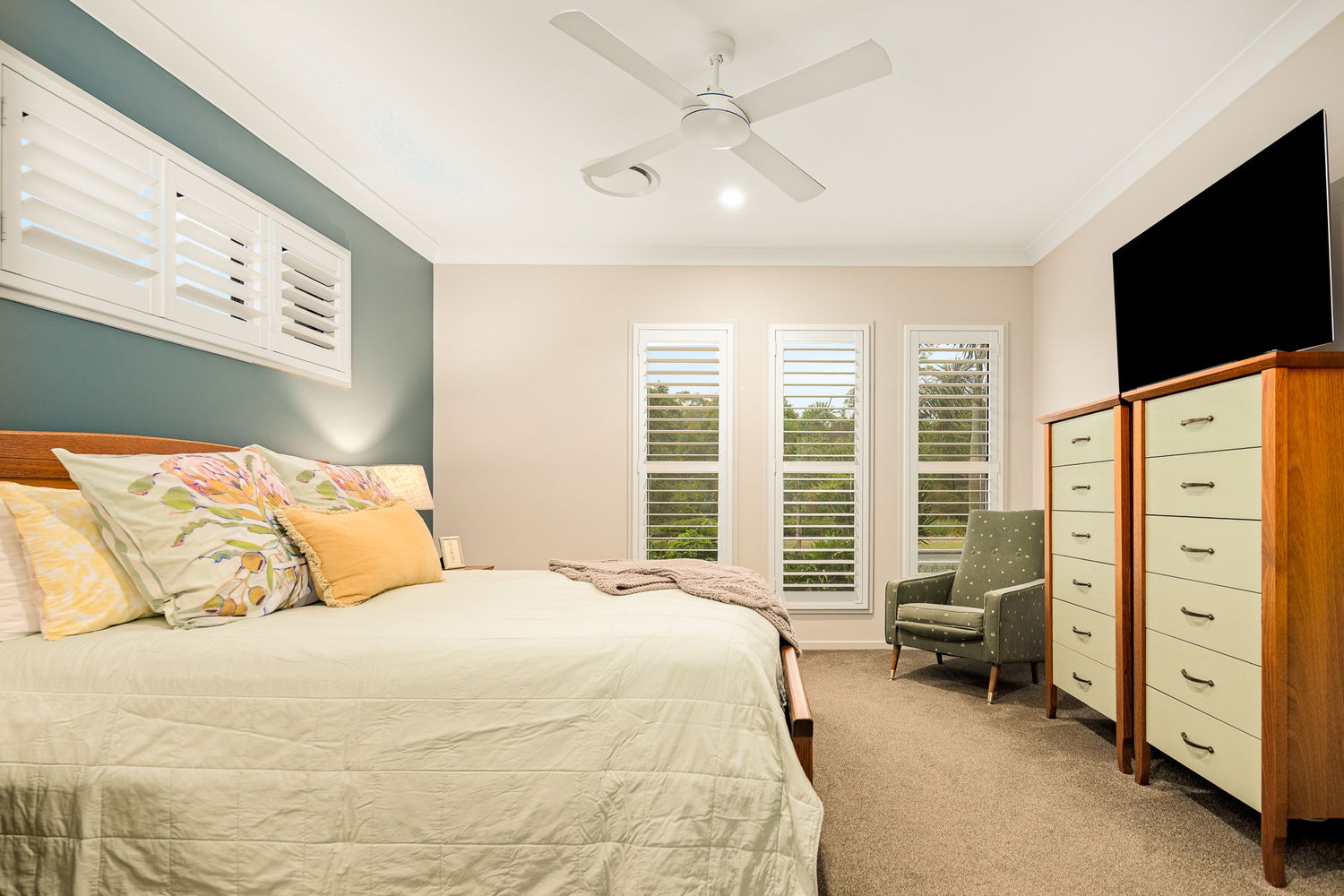 The home’s four bedrooms have been designed with both comfort and sophistication in mind. The master suite is a private haven, offering a true sense of retreat with its generous proportions, expansive walk-in robe, and a luxuriously appointed ensuite. Plantation shutters add a touch of elegance while providing perfect privacy and soft natural light. The three additional bedrooms are equally spacious and thoughtfully positioned, each offering built-in storage and plenty of room for family or guests — ideal for creating inviting spaces for rest, relaxation, or flexible use as a home office or study.