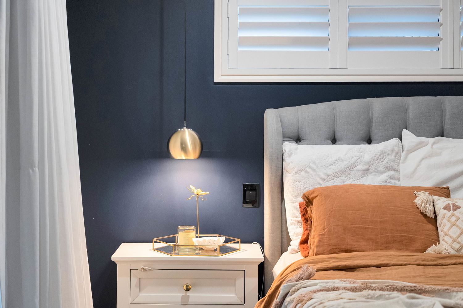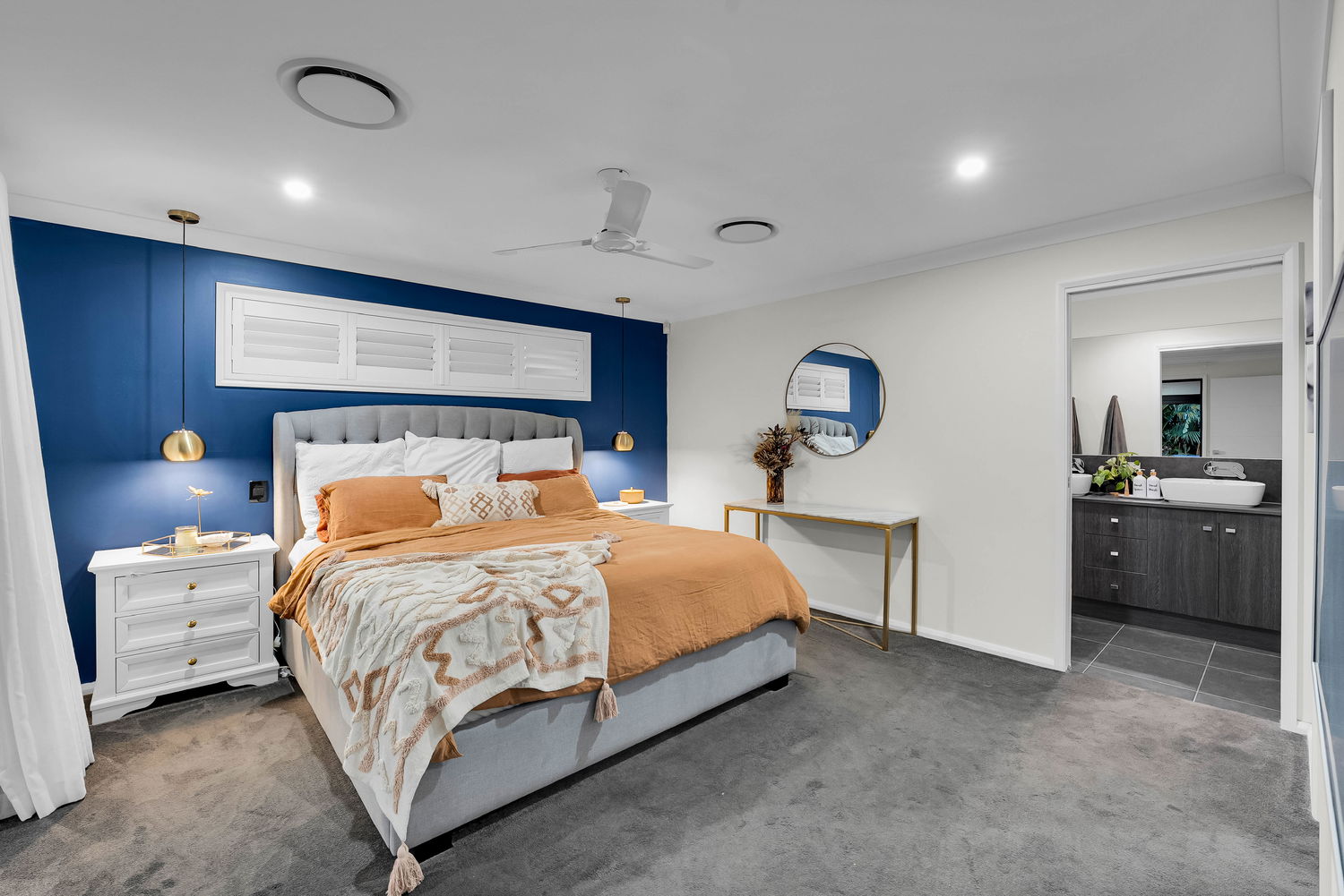 Featuring pendant bedside lighting and an oversized walk-in robe with drawers, hanging space and open shelving