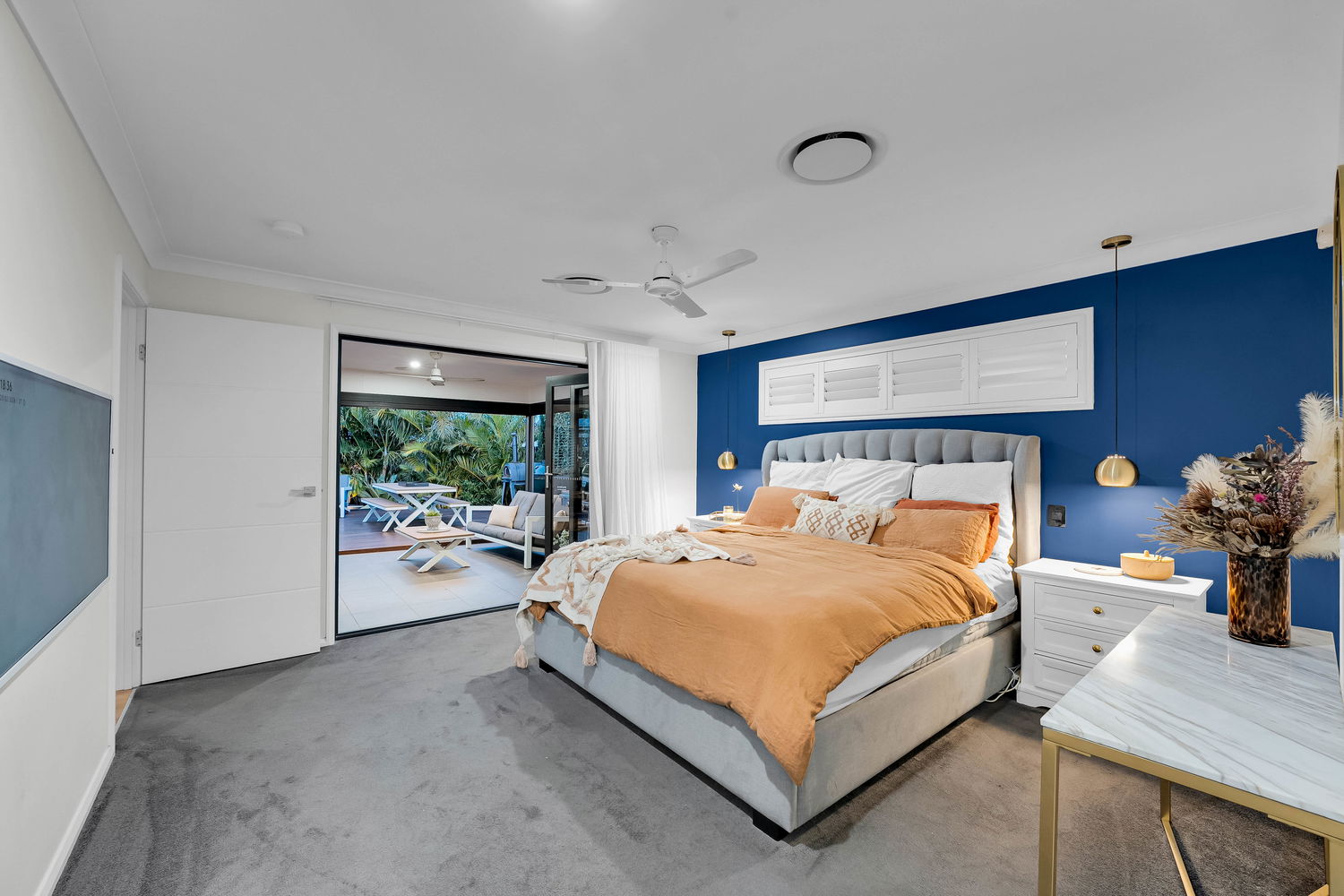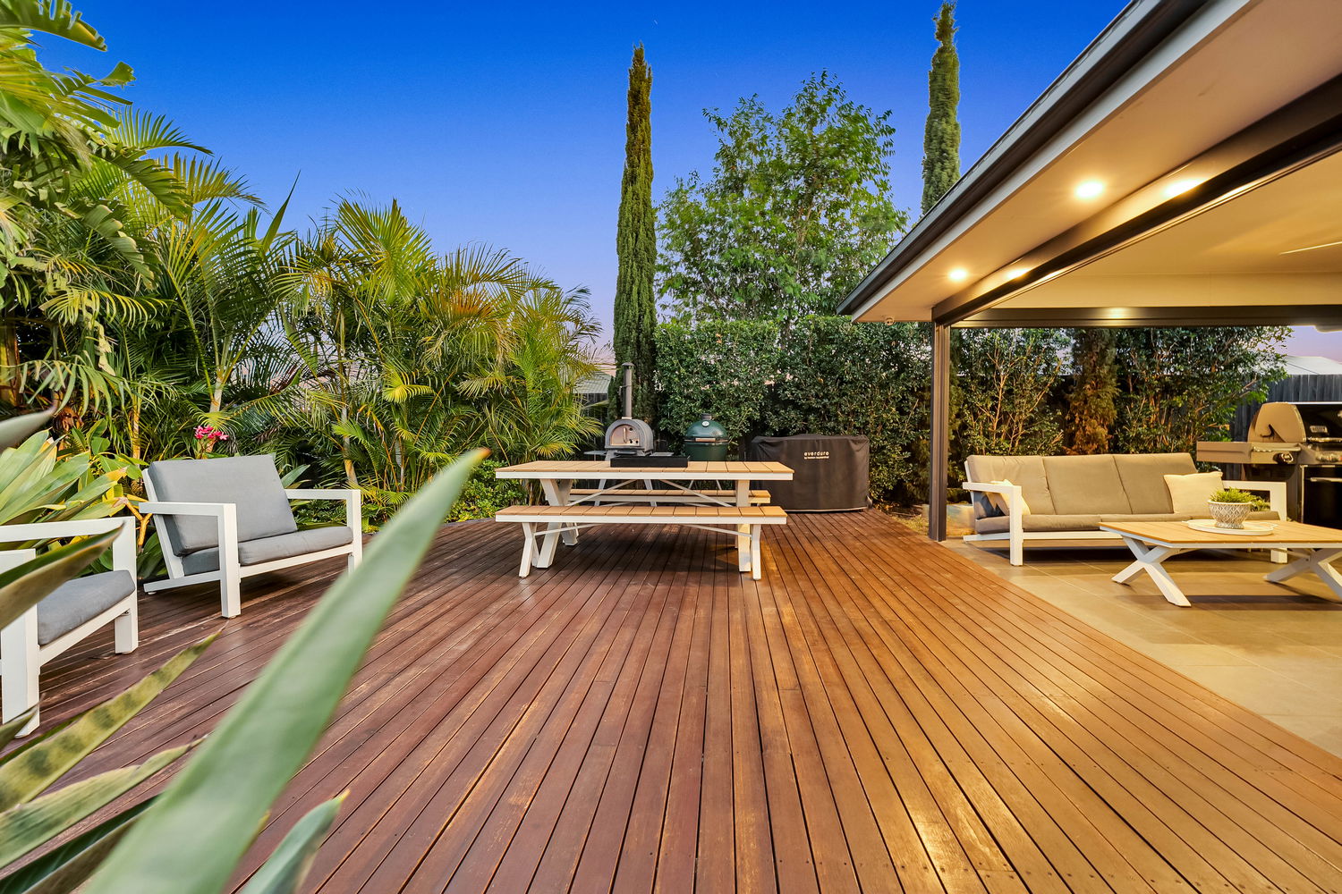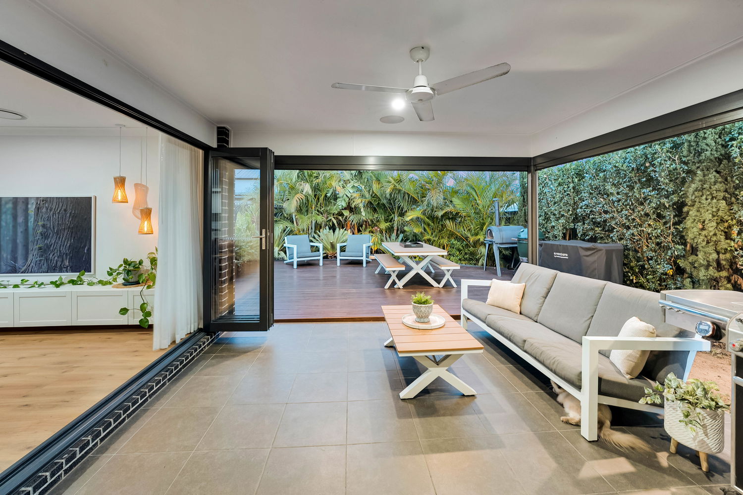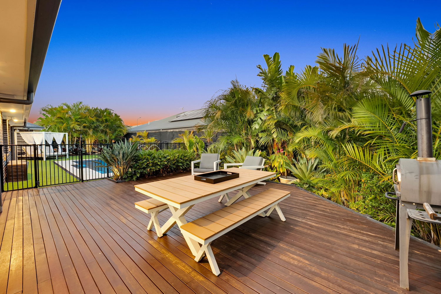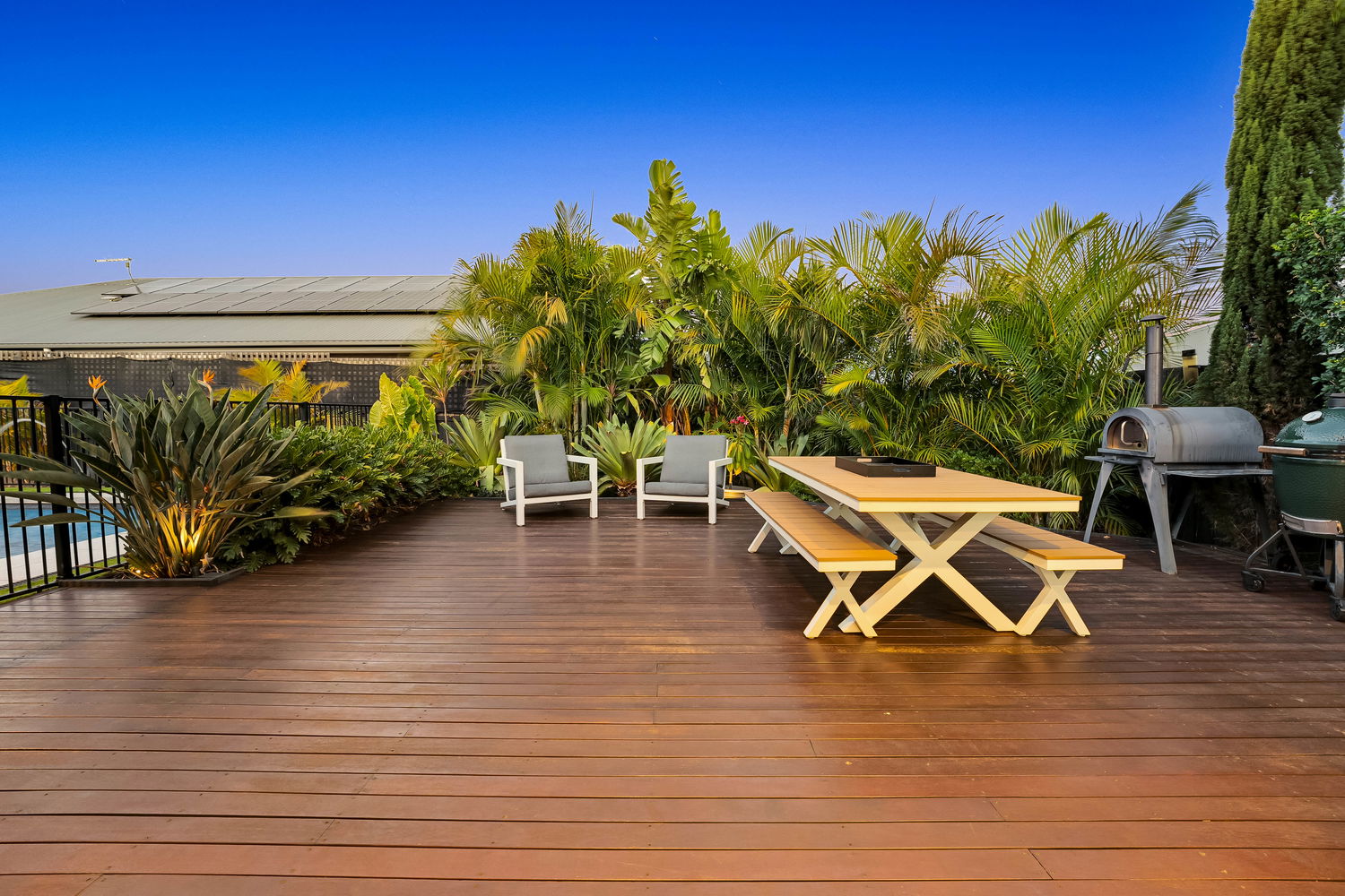 Two exceptional outdoor living zones including a tiled, covered alfresco with electric blinds (remote controlled and Apple Home compatible) and gas bayonet for BBQs, plus approximately 50m² of Merbau timber decking overlooking the pool and framed by lush subtropical gardens