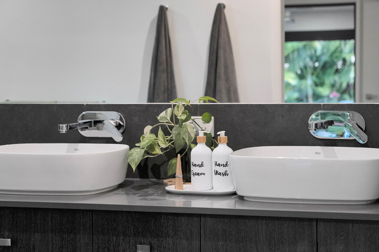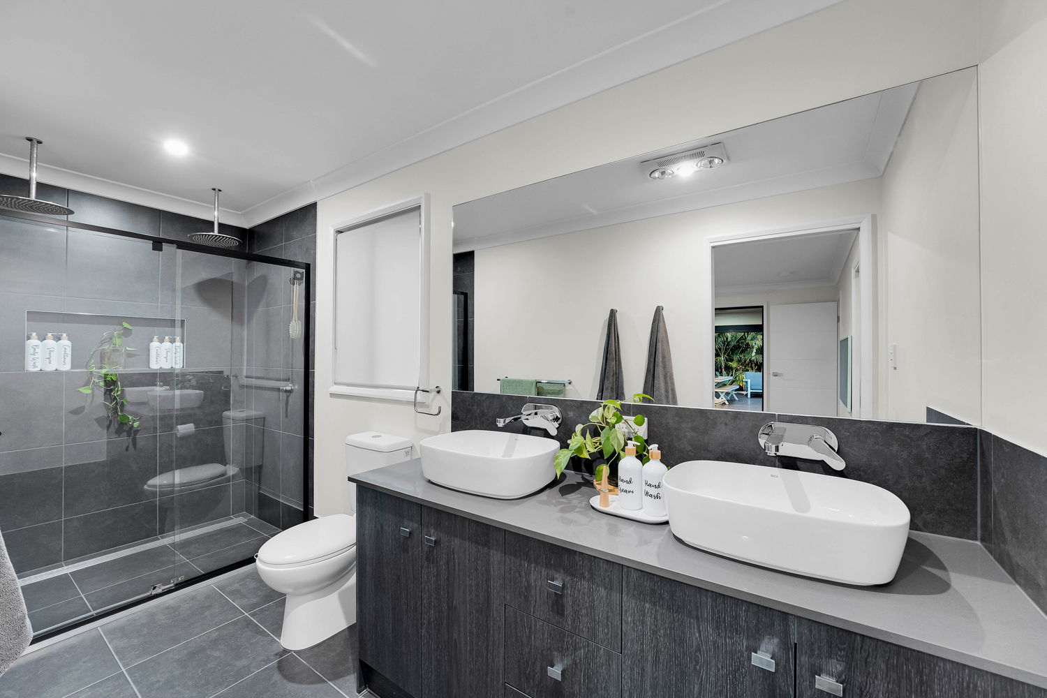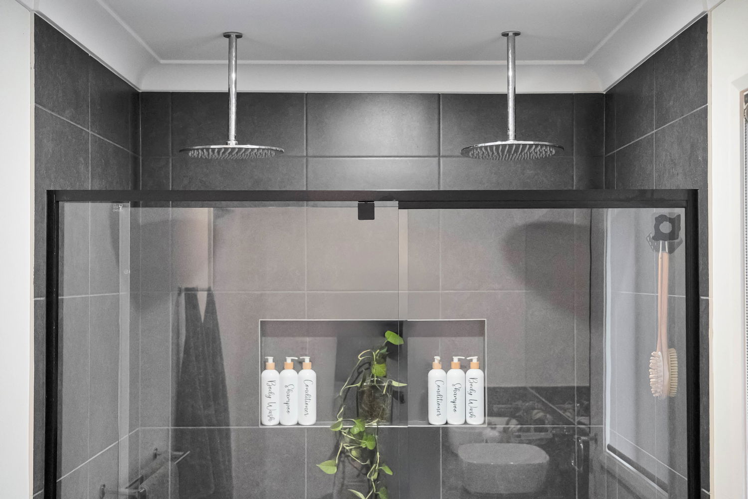 Resort style, floor-to-ceiling tiled ensuite with indulgent double shower featuring twin rain heads and niche, double porcelain vanity basins and toilet