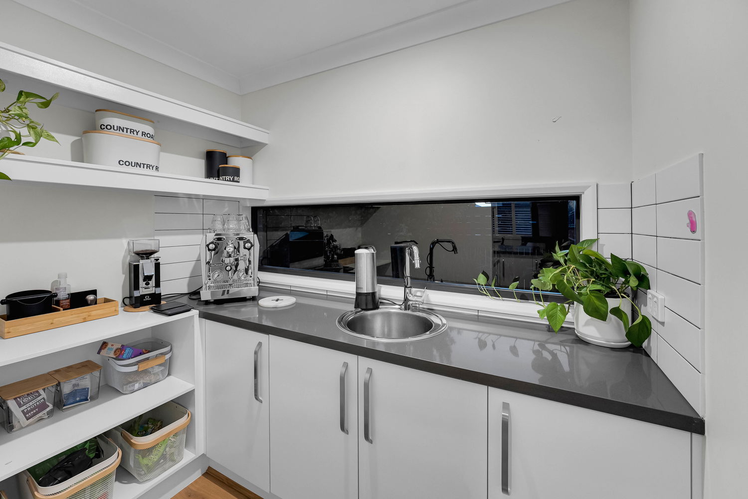 With 40mm stone benchtops, sink, extensive soft-close cabinetry and shelving, plus a feature window allowing natural light to pour in