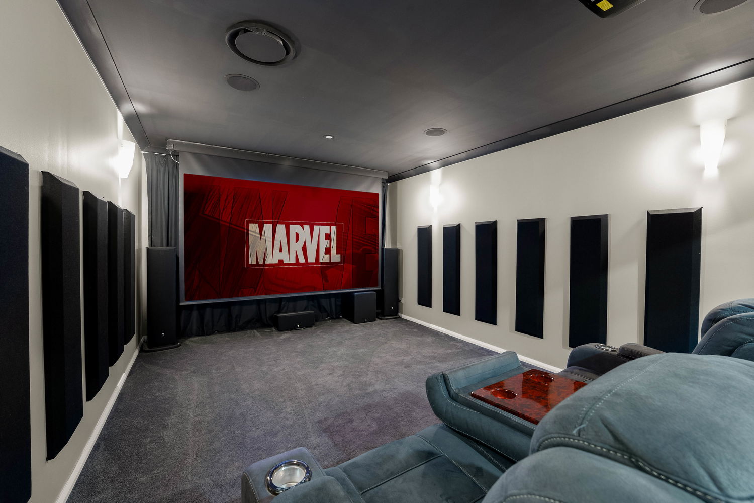 Featuring 11.2 Dolby Atmos audio, 120-inch automated drop-down screen, JVC projector, acoustic wall panelling and blackout curtains for the ultimate cinematic experience