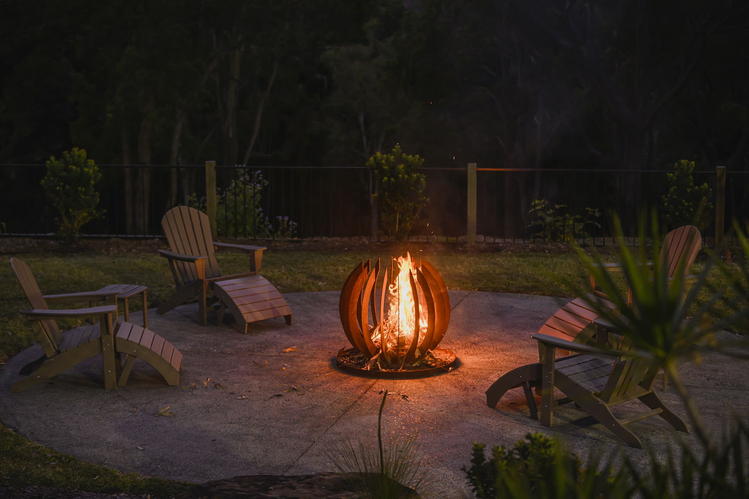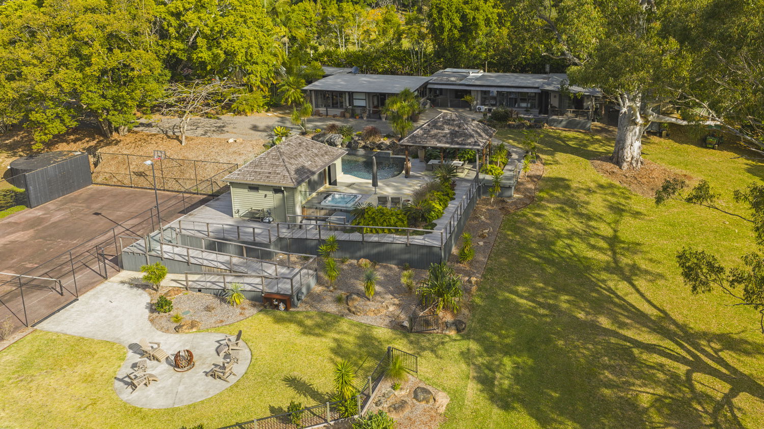 | Full-size tennis court, fire pit zone, spa, and landscaped surrounds