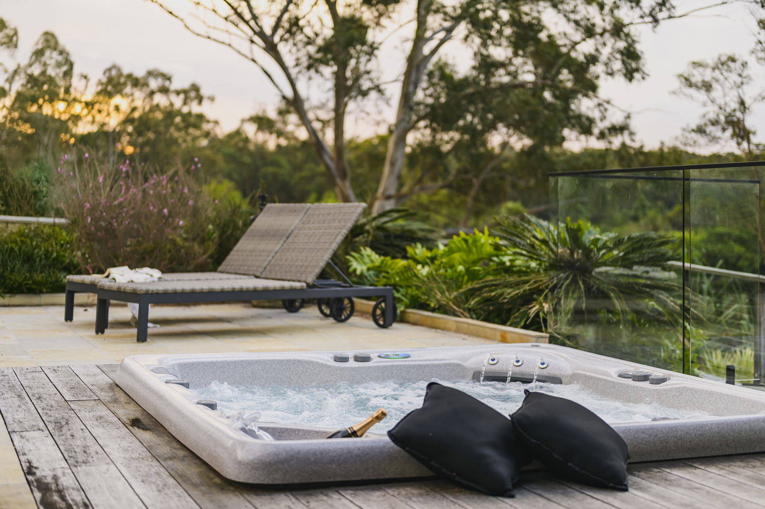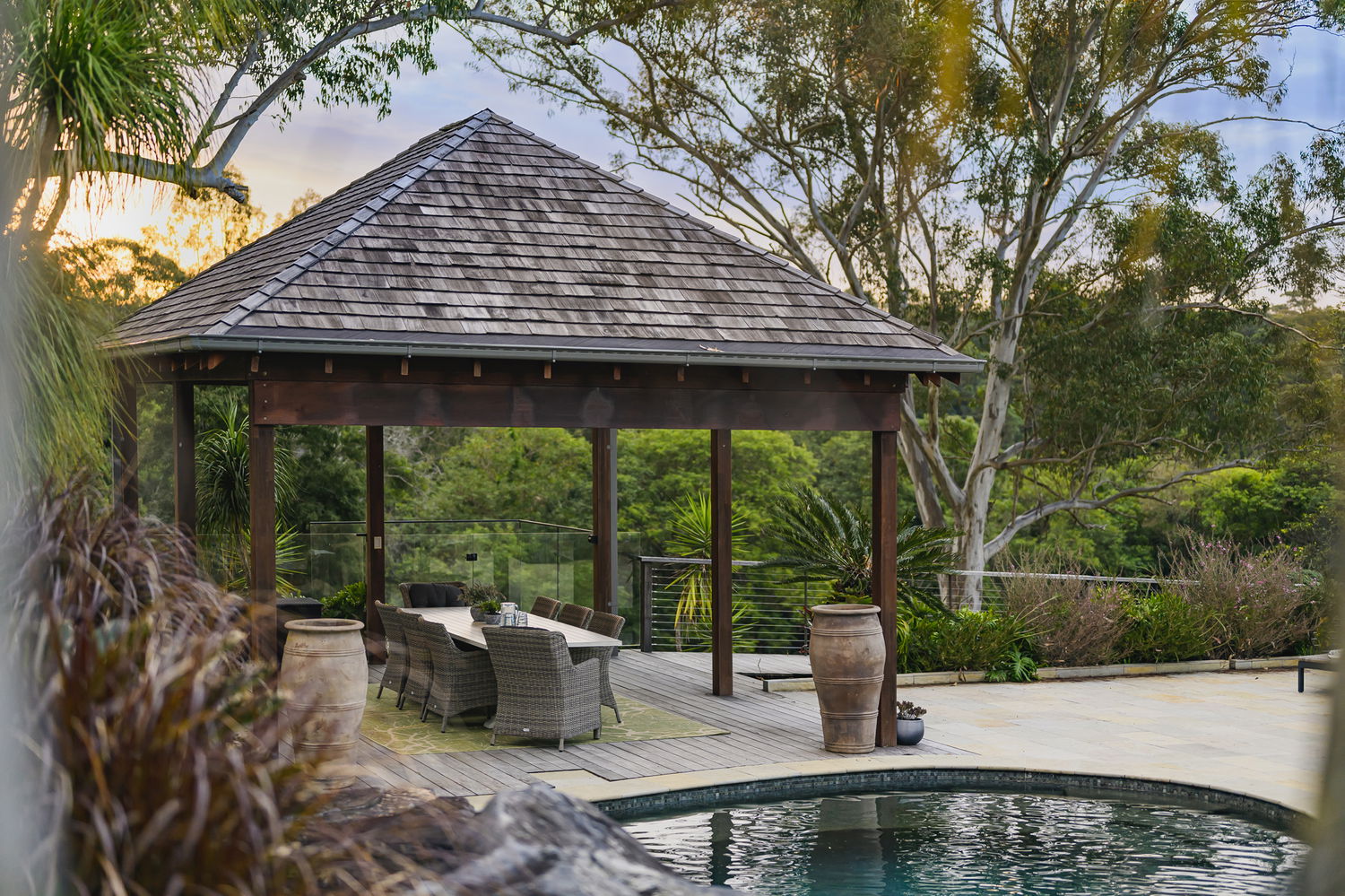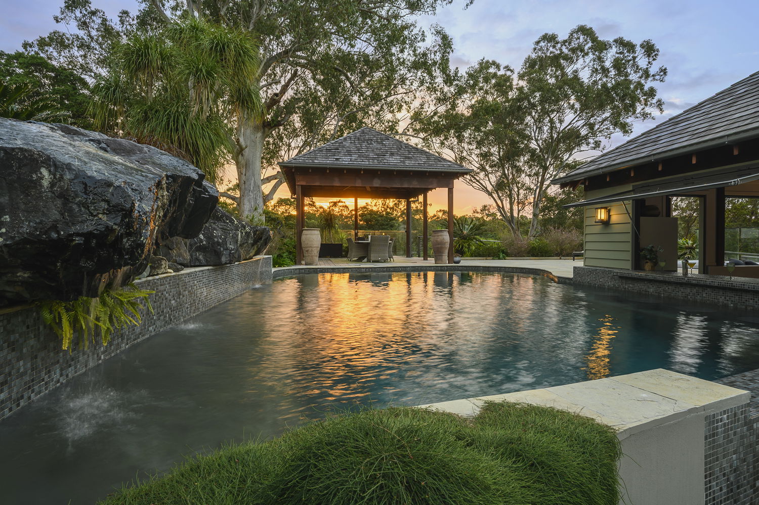 The estate’s centrepiece is a spectacular pool and pavilion precinct, completed in 2022. A sparkling freshwater pool with natural stone features, swim-up bar, and integrated seating is framed by landscaped surrounds and twin Canadian cedar-roofed pavilions. Together, they create a private five-star retreat at home. An enclosed pool pavilion offers a full outdoor kitchen with Dekton benchtops, dual fridges, 65” Samsung Terrace TV, and powder room, while the dining pavilion provides an elevated entertaining space with timber decking and fans. A hydrotherapy spa, fire pit zone, and children’s playground complete the resort setting.