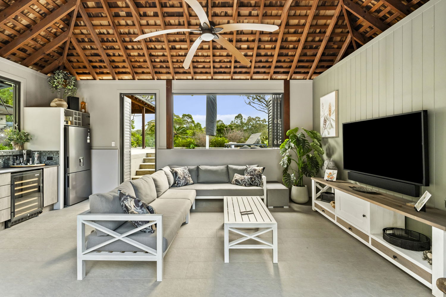| Enclosed pool pavilion with outdoor kitchen/bar, dual fridges, 65” Samsung Terrace TV, and powder room