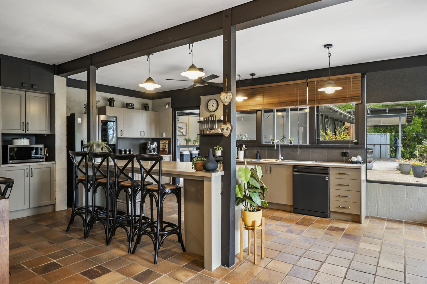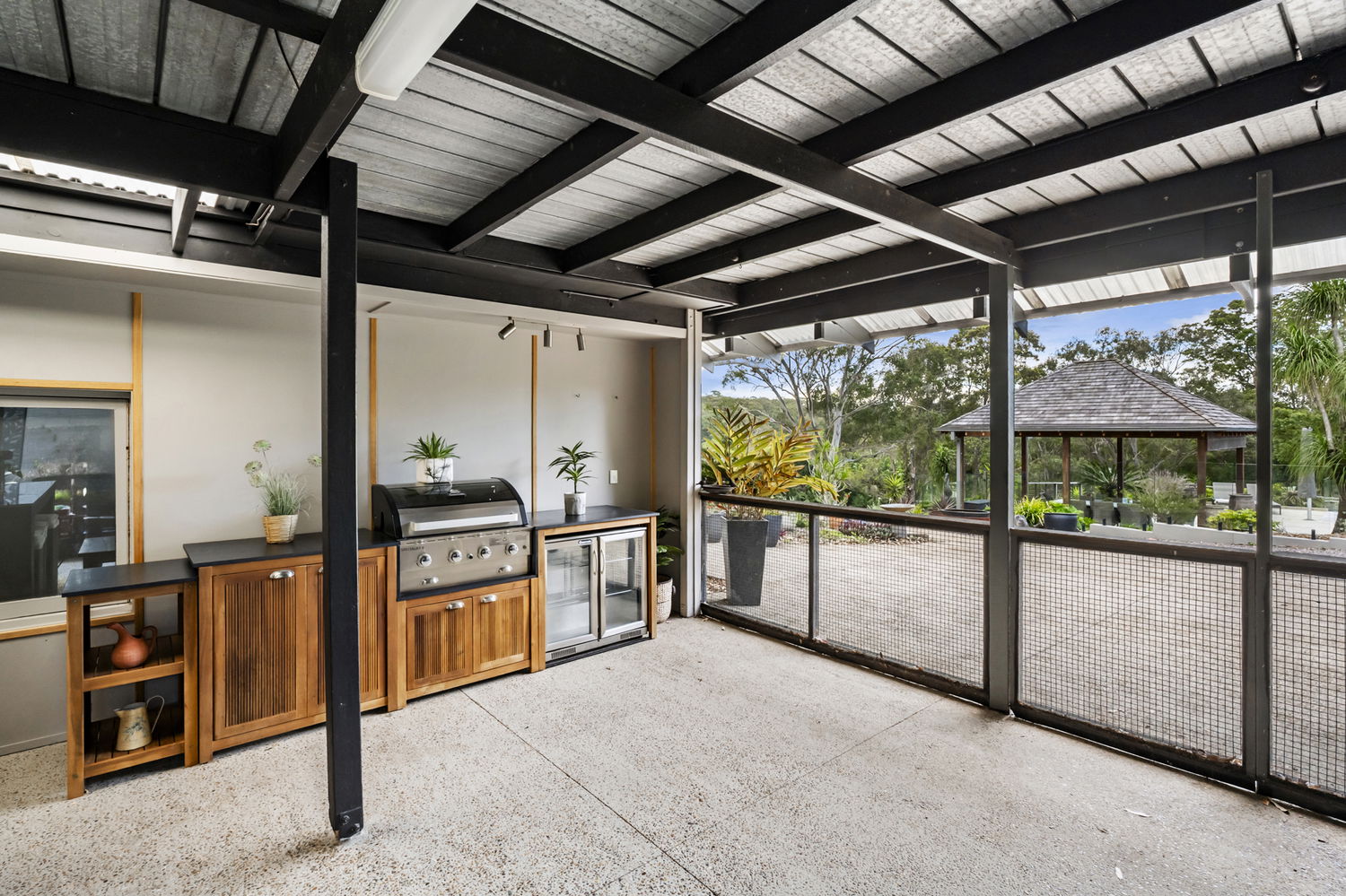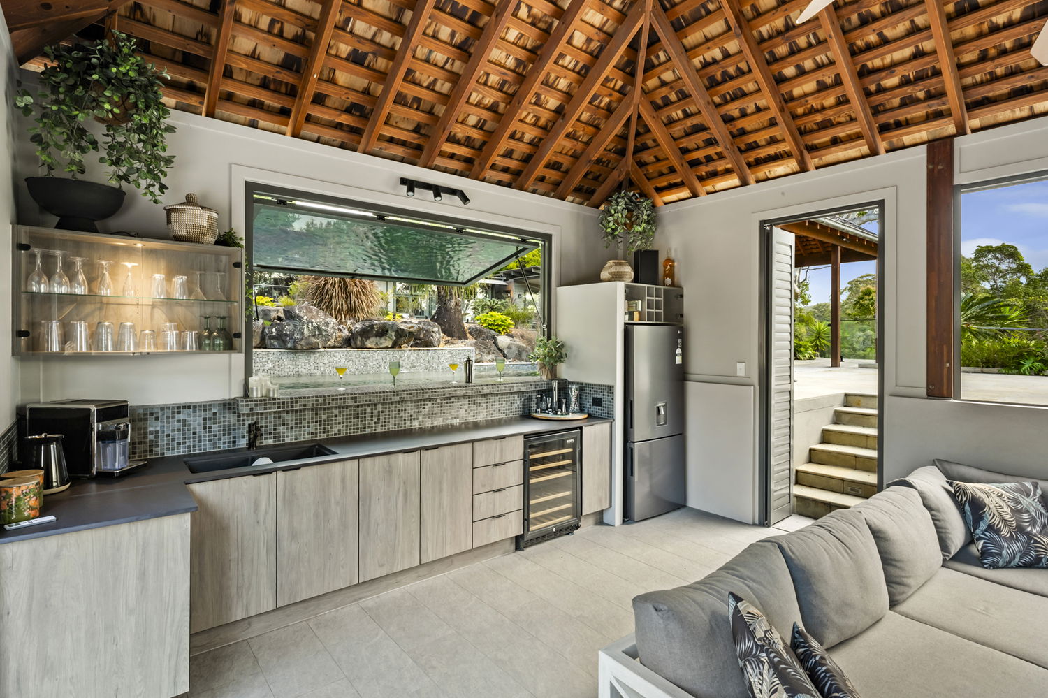 At its heart, the home is designed for flexible family living. Across four bedrooms and multiple living areas, the residence also features a secondary kitchenette, creating scope for multi-generational households or guest accommodation. Expansive glass, timber detail, and natural finishes reflect Gabriel Poole’s signature style, while practical touches such as abundant storage, split system air-conditioning, and seamless indoor-outdoor flow ensure it functions as beautifully as it looks.