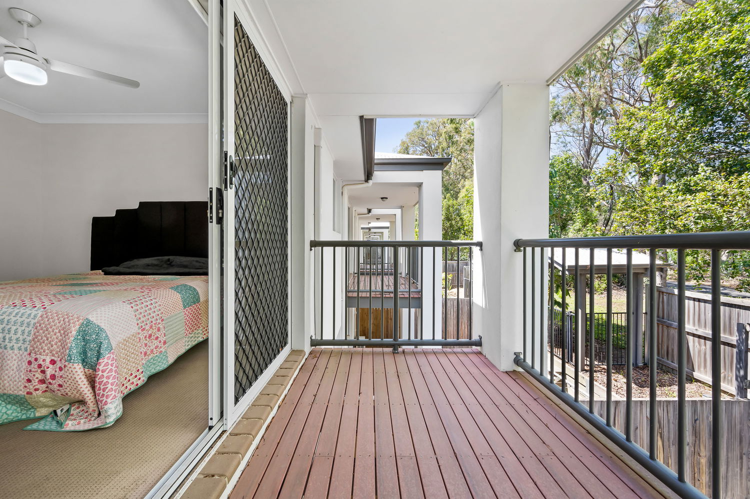 Upstairs, the master bedroom offers its own private retreat with air-conditioning, a ceiling fan, double mirrored built-in robes and sliding doors opening onto a generous balcony. The ensuite features a shower and vanity, while the second and third bedrooms both include ceiling fans and mirrored built-in robes. The main bathroom includes both a separate bath and shower along with a separate toilet for added convenience.