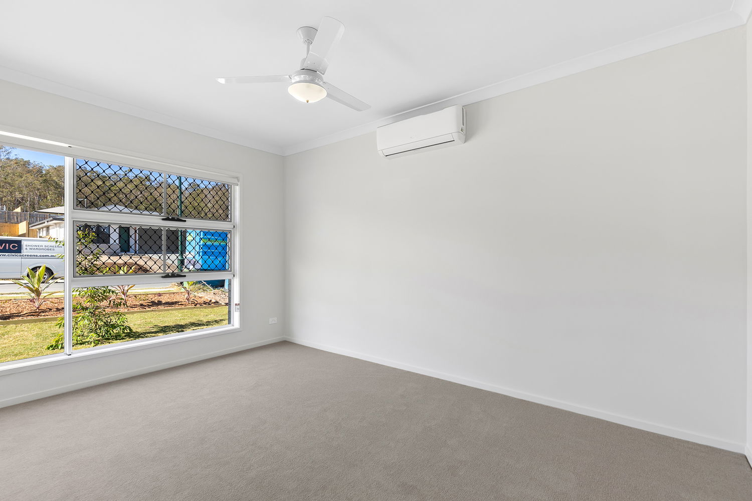 # Second bedroom with split system air conditioning, ceiling fan, built-in robe, and private ensuite