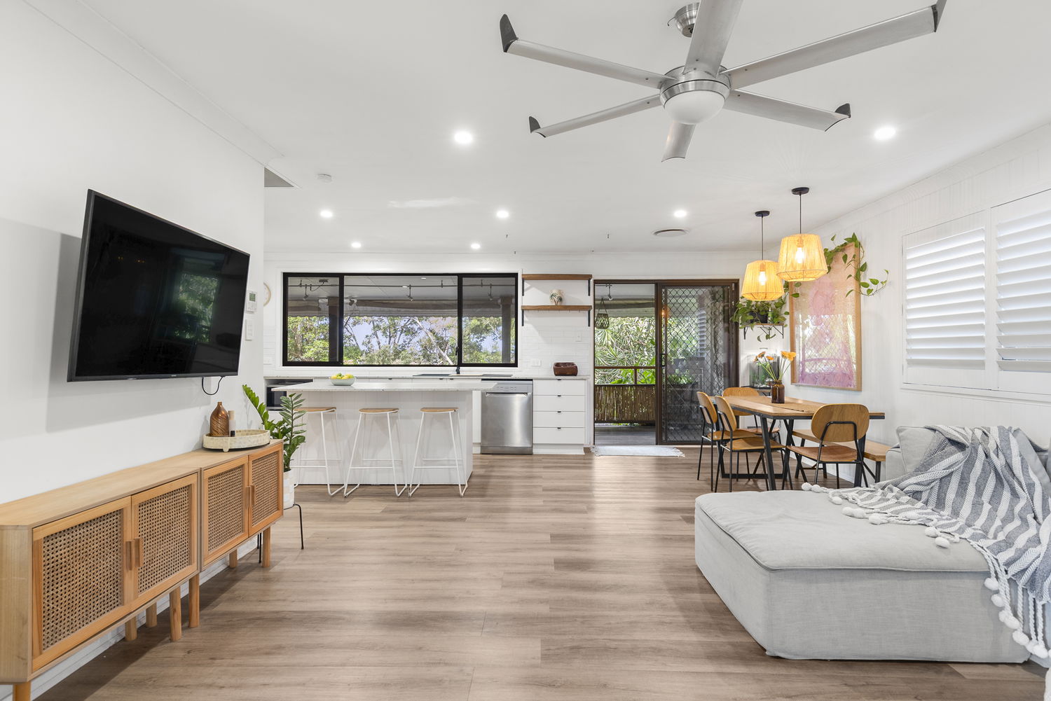 The upper level is light-filled and welcoming, anchored by a large family kitchen featuring a butler’s pantry and striking splashback. Flowing into open-plan living and dining zones, this level enjoys excellent natural light and a relaxed, coastal feel. A study nook, ceiling fans throughout, and ducted split-system air conditioning upstairs (with a recently installed new PC unit) provide everyday comfort and functionality.