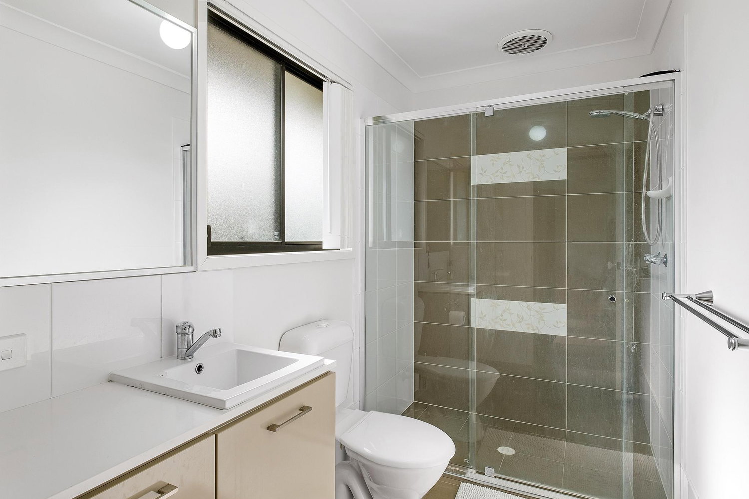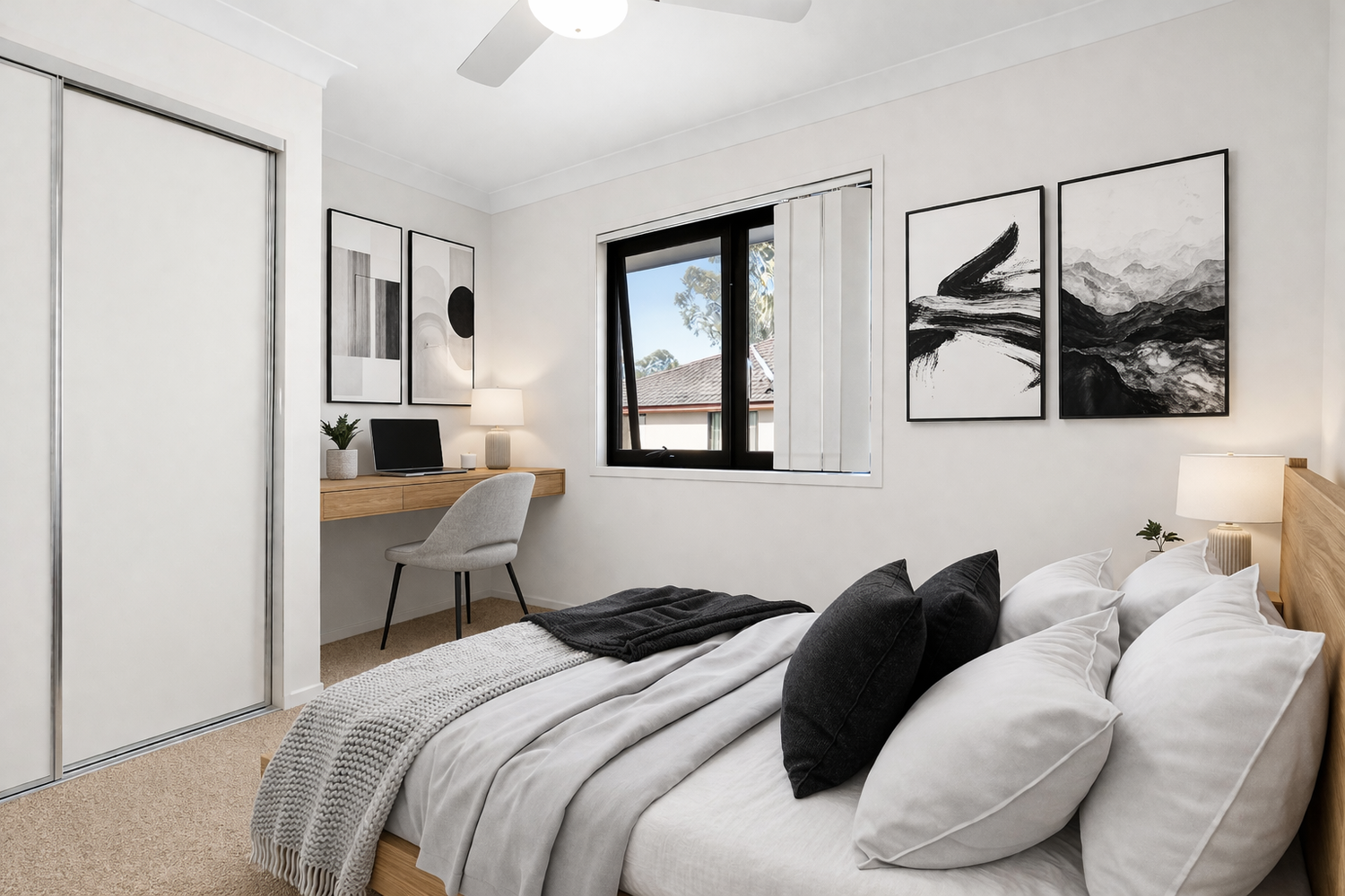 Upstairs, accommodation is thoughtfully designed across three well-sized bedrooms all with ceiling fans. The master bedroom includes with split-system air-conditioning, a generous built-in robe, private ensuite and its own balcony, perfect for capturing the afternoon breeze. The second bedroom is also fitted with a built-in robe and the third bedroom offers versatility with a built-in robe and integrated study desk, ideal for remote work or study. A well appointed main bathroom services the upper level, featuring a shower over bath and ample vanity storage.