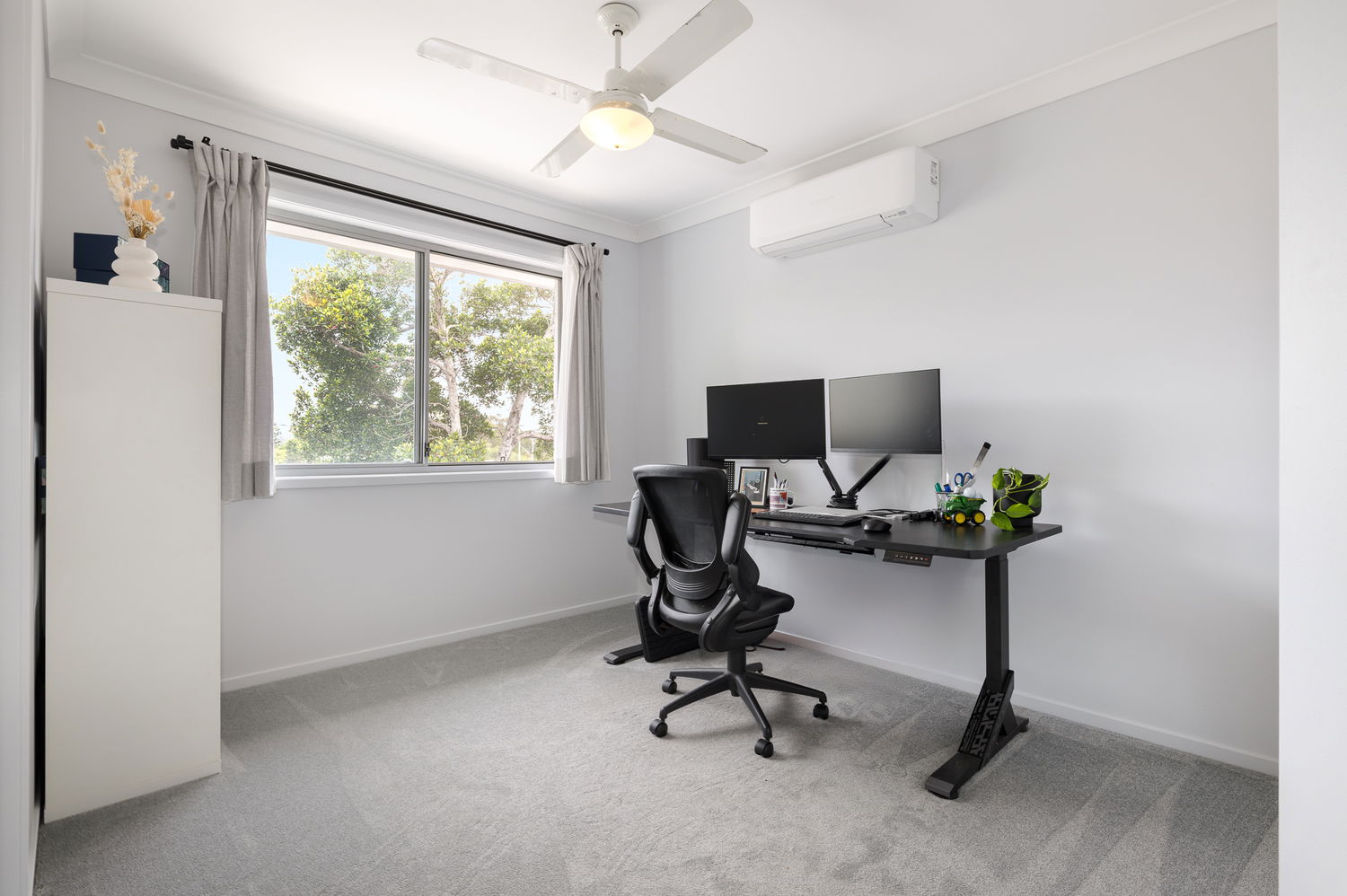 Upstairs are three spacious bedrooms with built-in wardrobes and ceiling fans, each fitted with brand new split-system air-conditioning units. The master bedroom enjoys a walk-in robe, ensuite and private north-facing balcony. With its corner position and only one neighbour, this townhouse enjoys extra privacy and natural light rarely found in complex living.